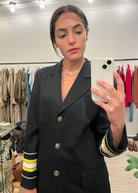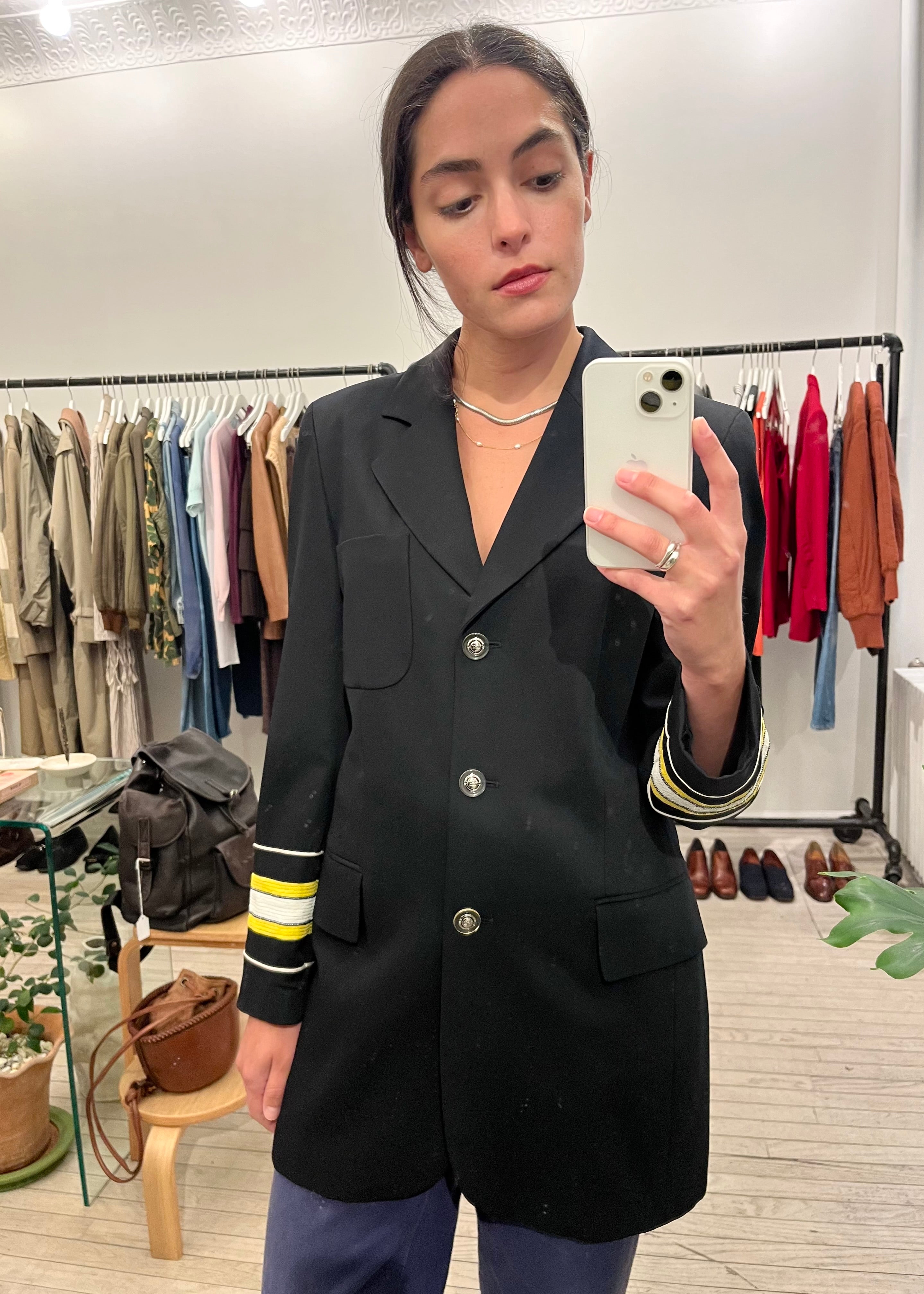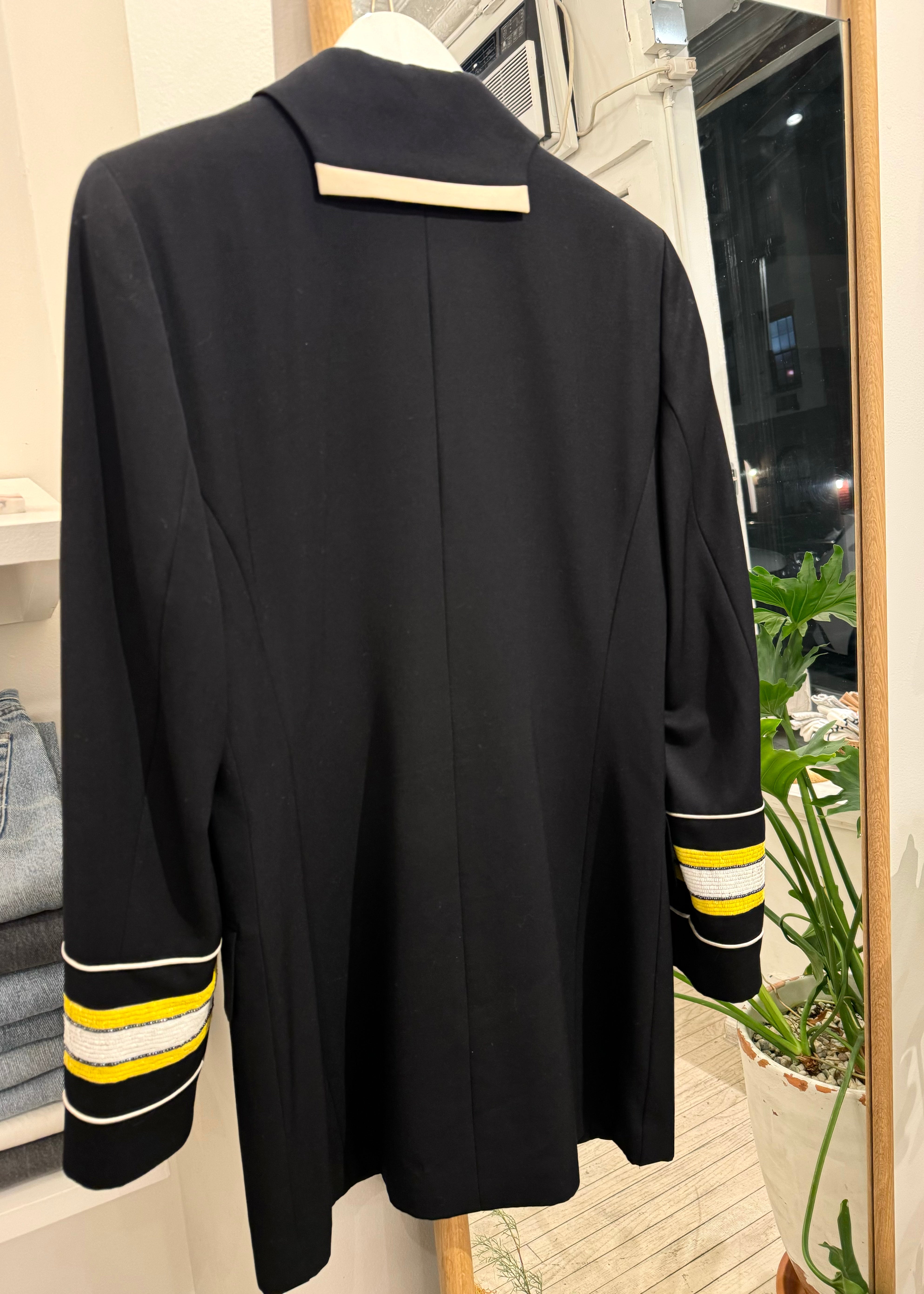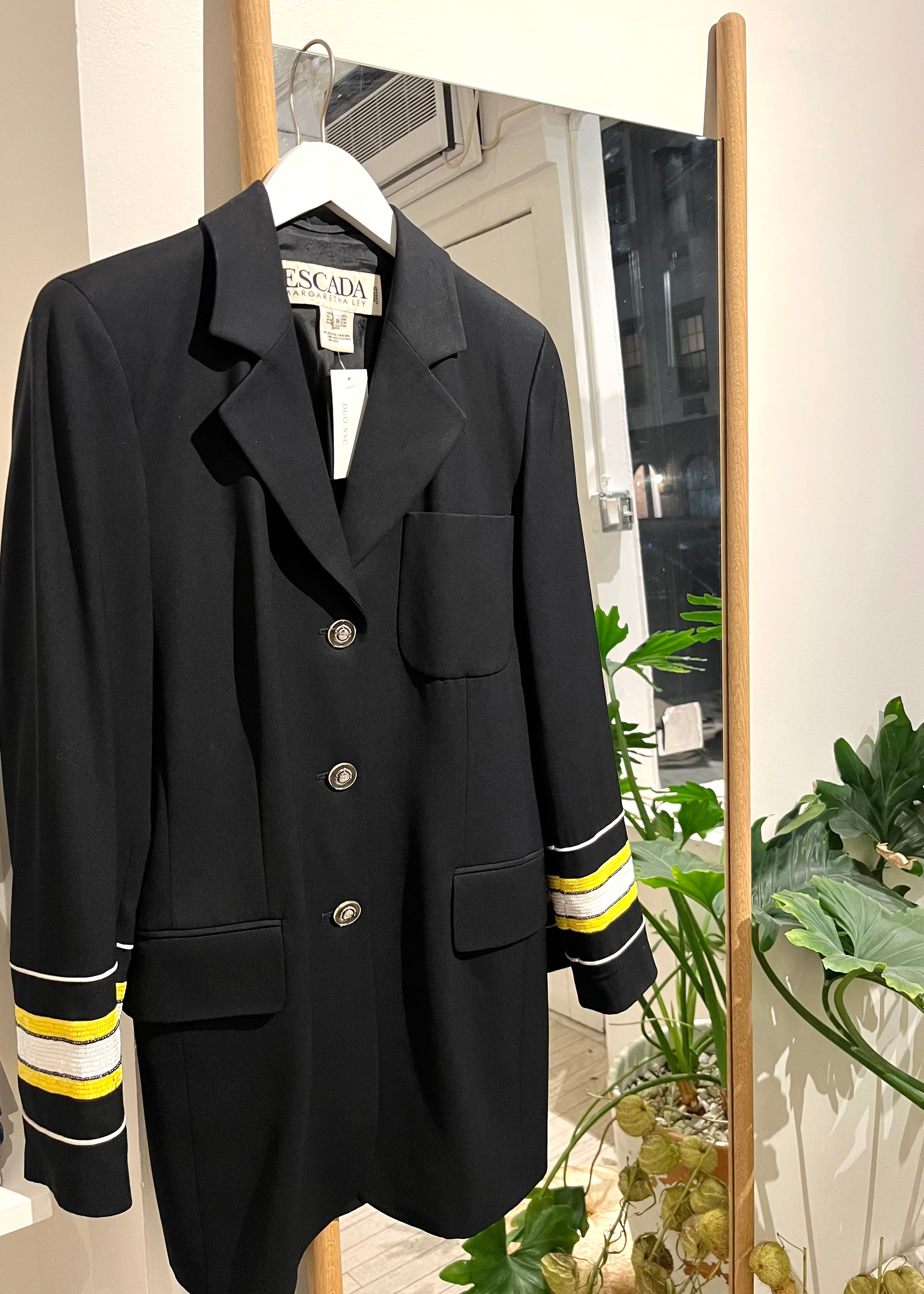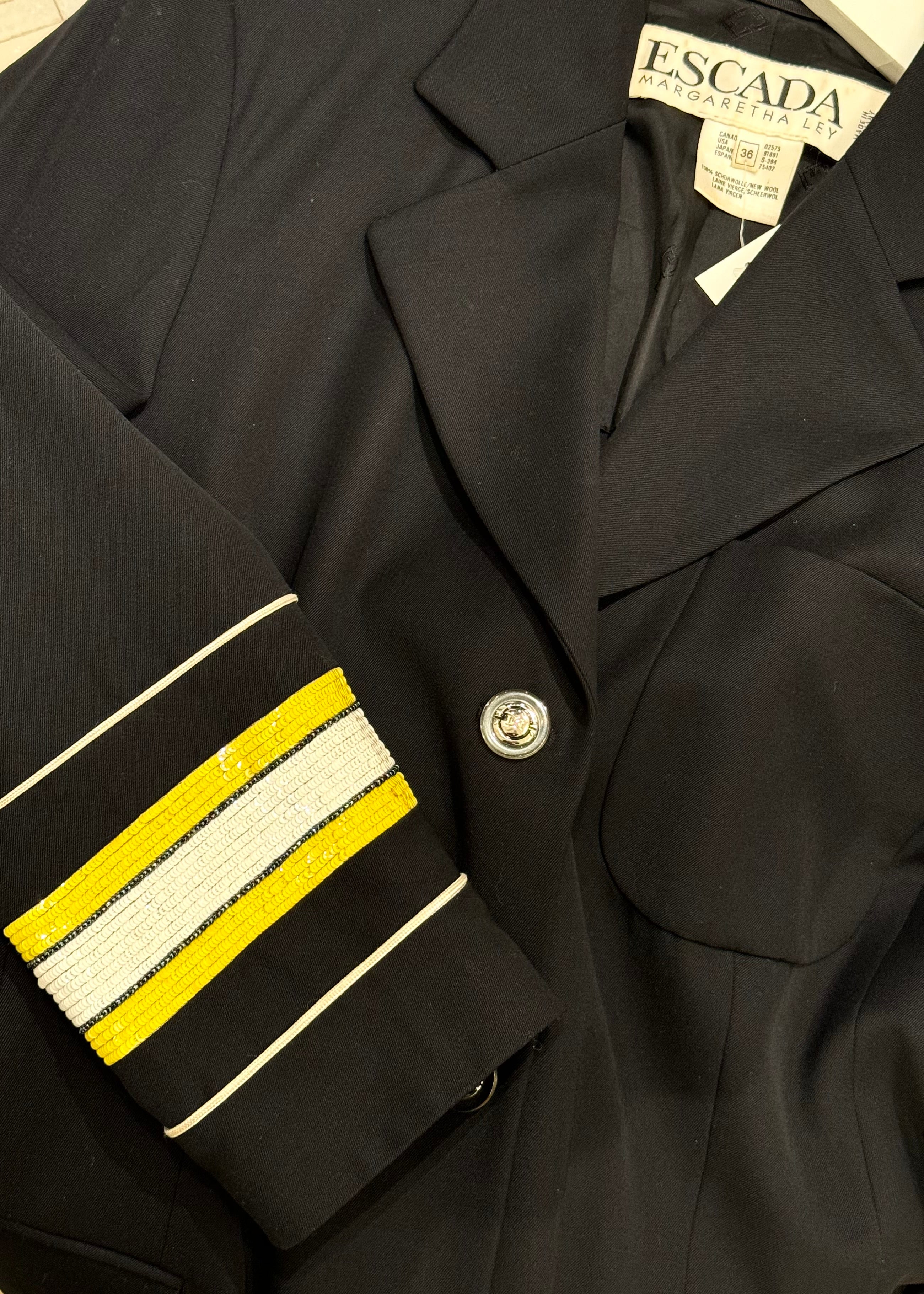 Vintage Escada blazer with sequin and bead sleeve detail. Front button closure. Three front pockets.