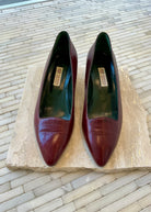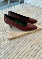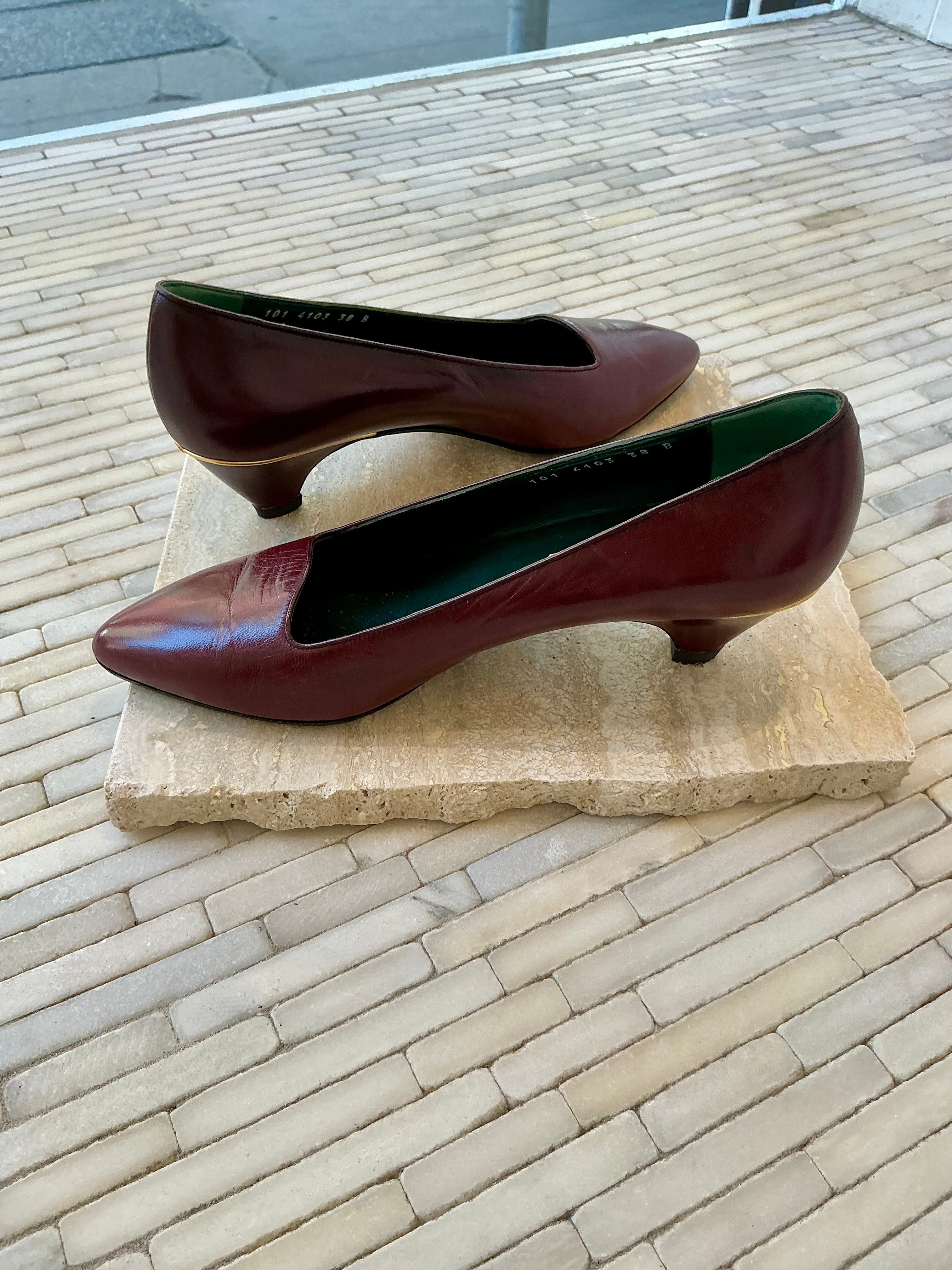 Vintage burgundy Gucci kitten heels with gold trim around the heel.