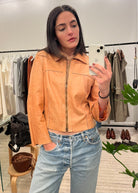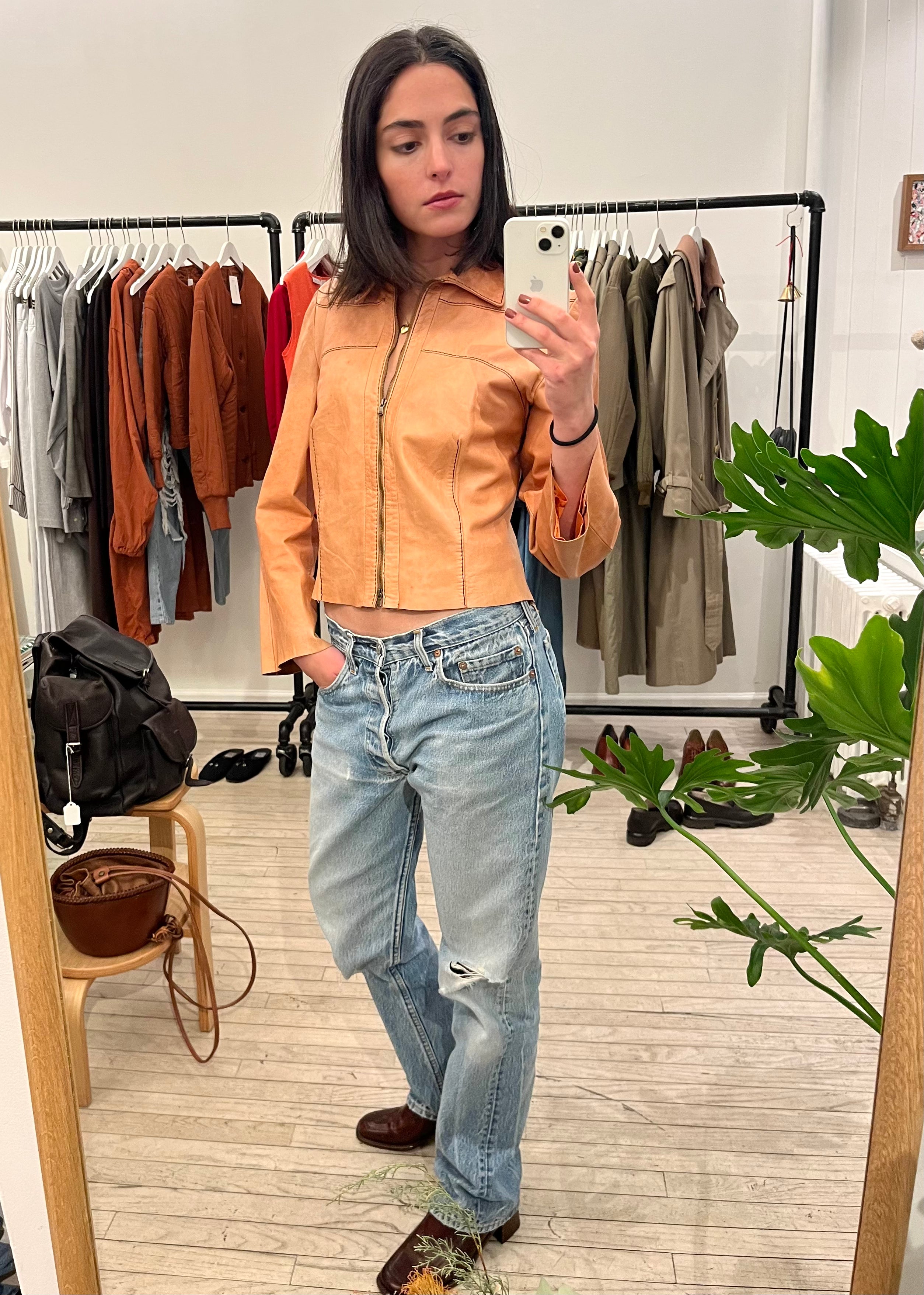 Vintage leather jacket. Zip front closure. Fully lined, lightweight. Buttery soft. Markings throughout giving it a vintage patina.