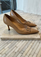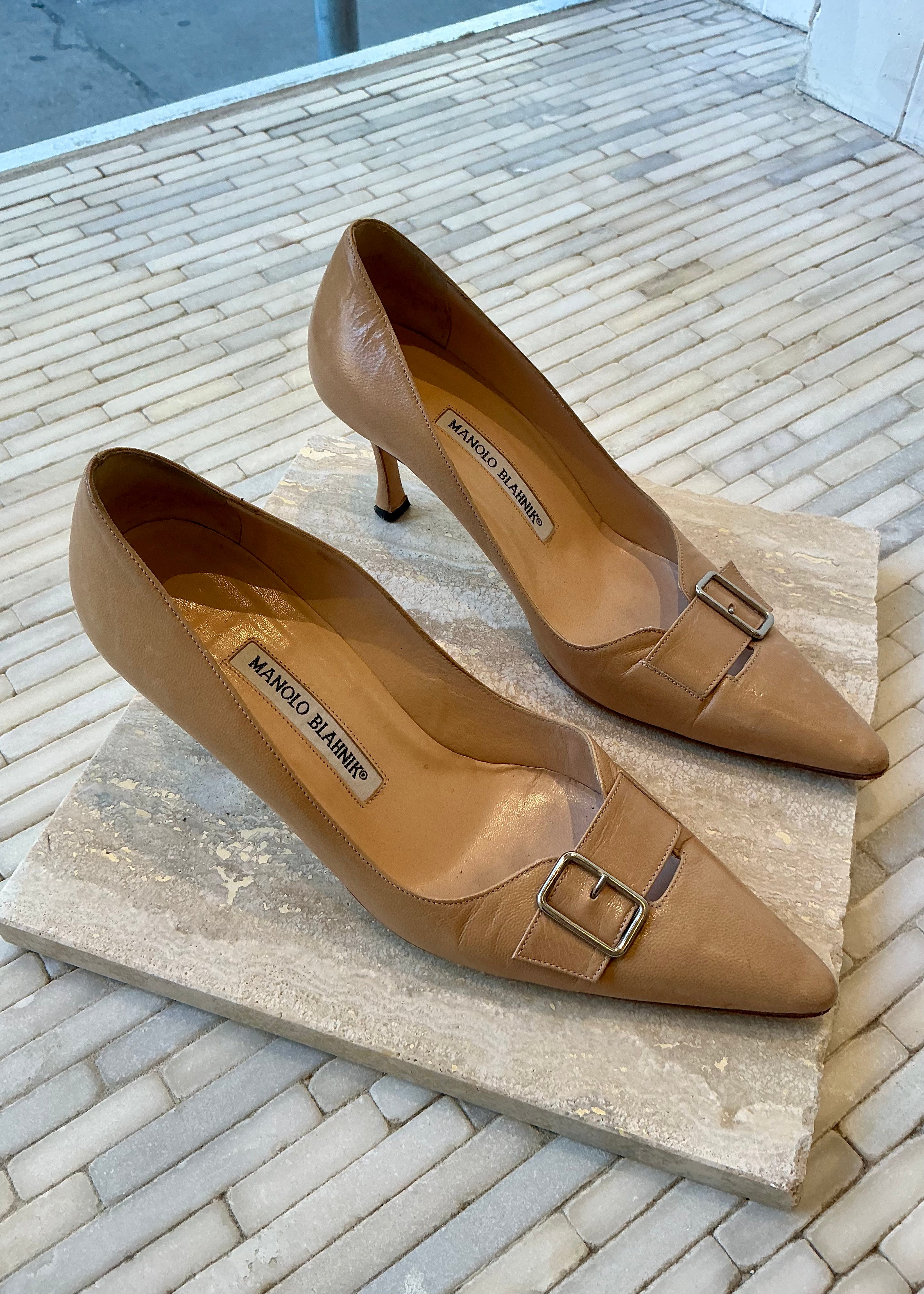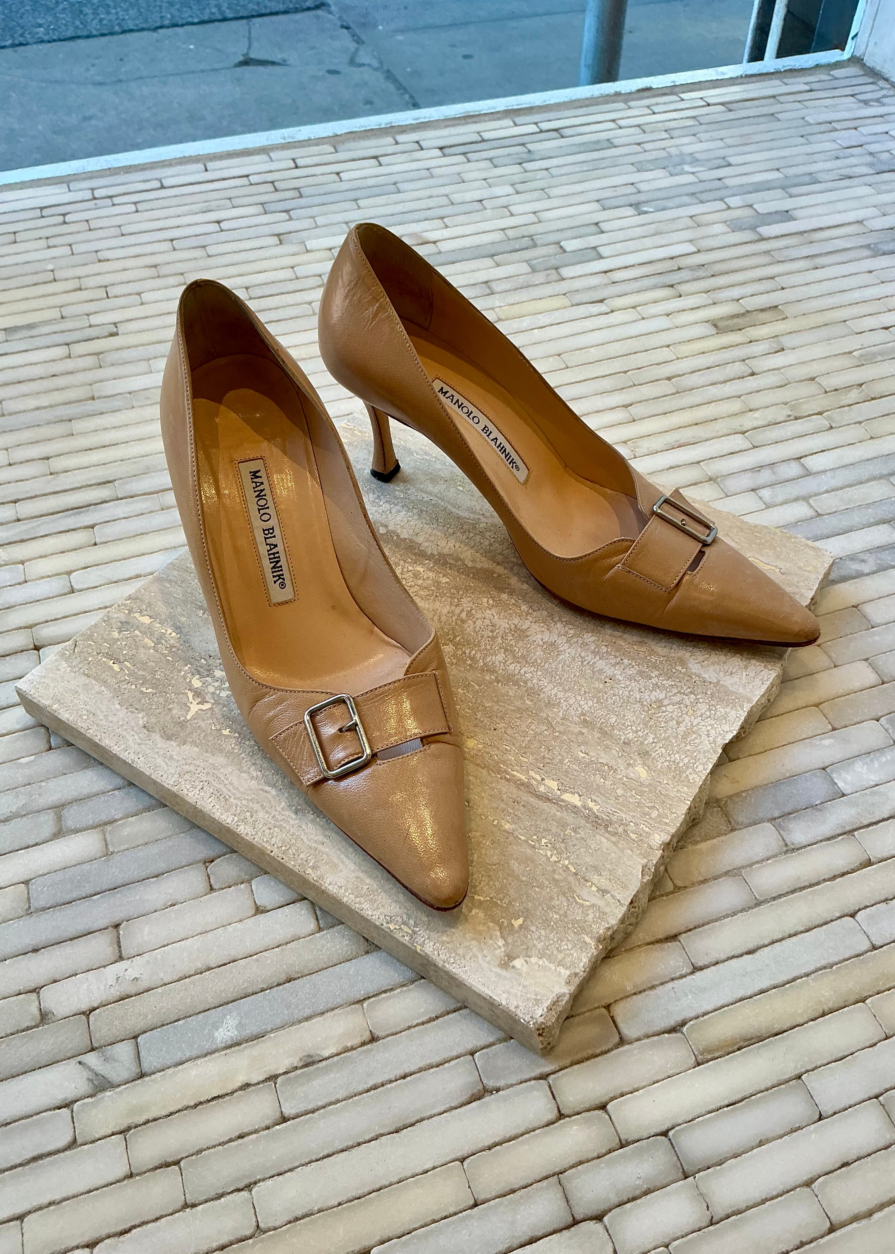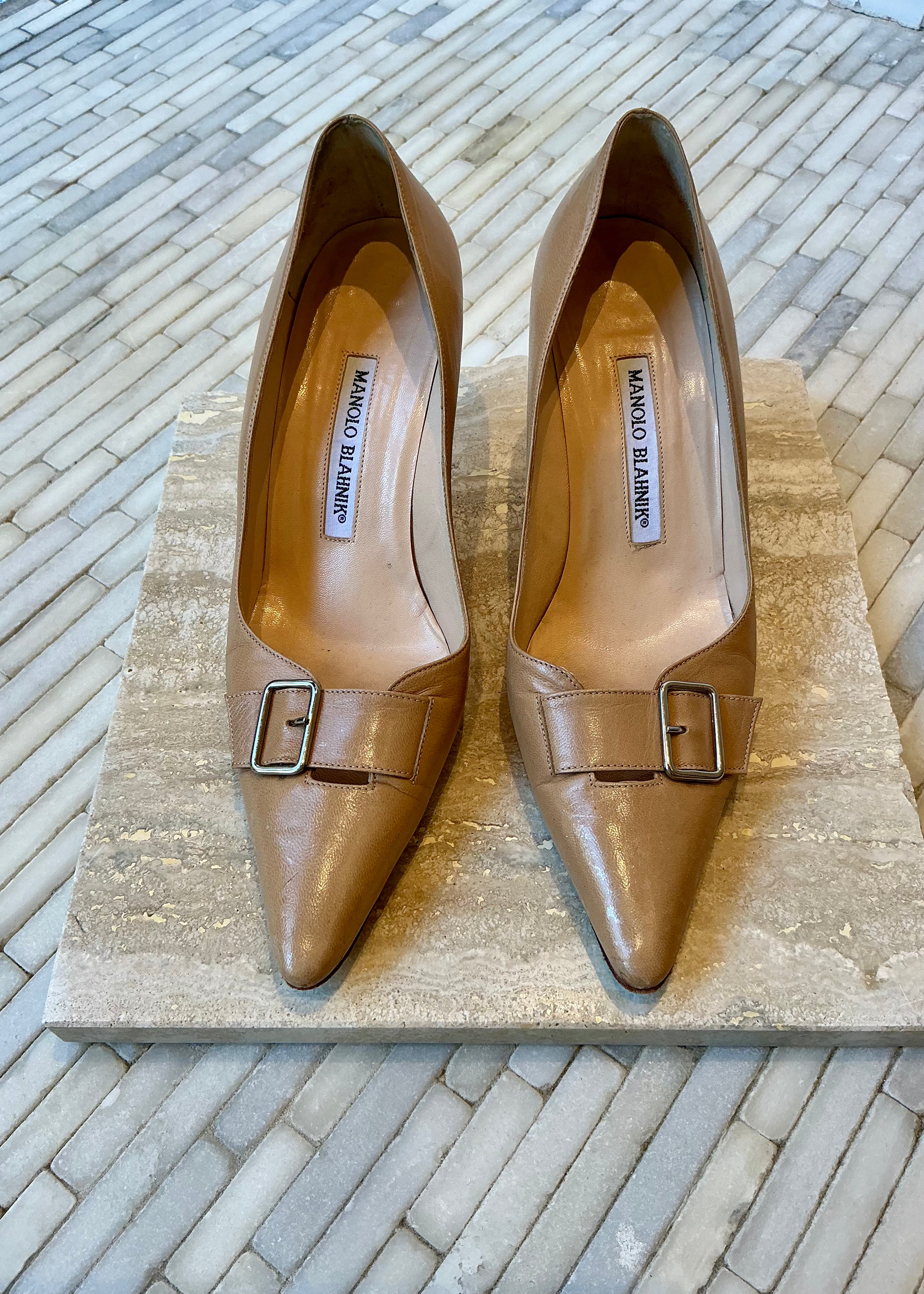 Vintage leather Manolo Blahnik heels with buckles at front of the shoe. 2 1/2 inch heel.