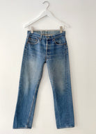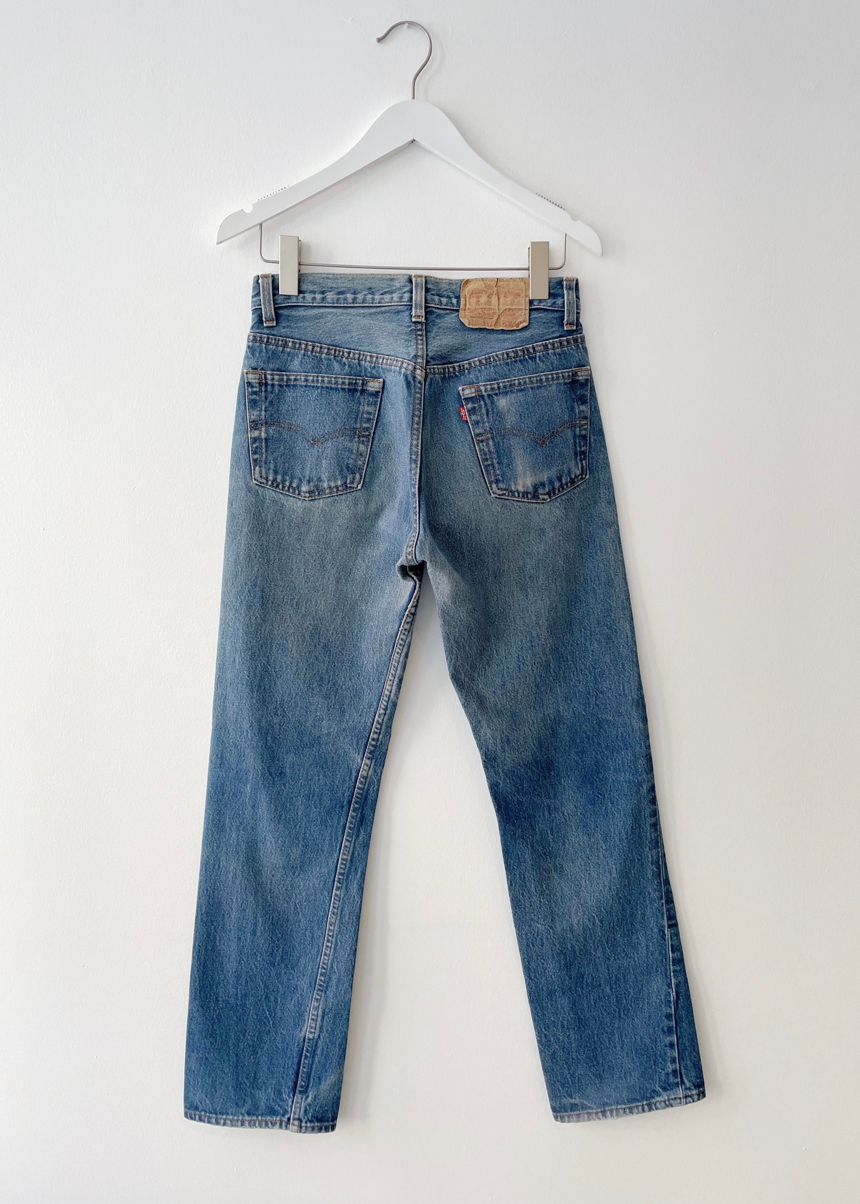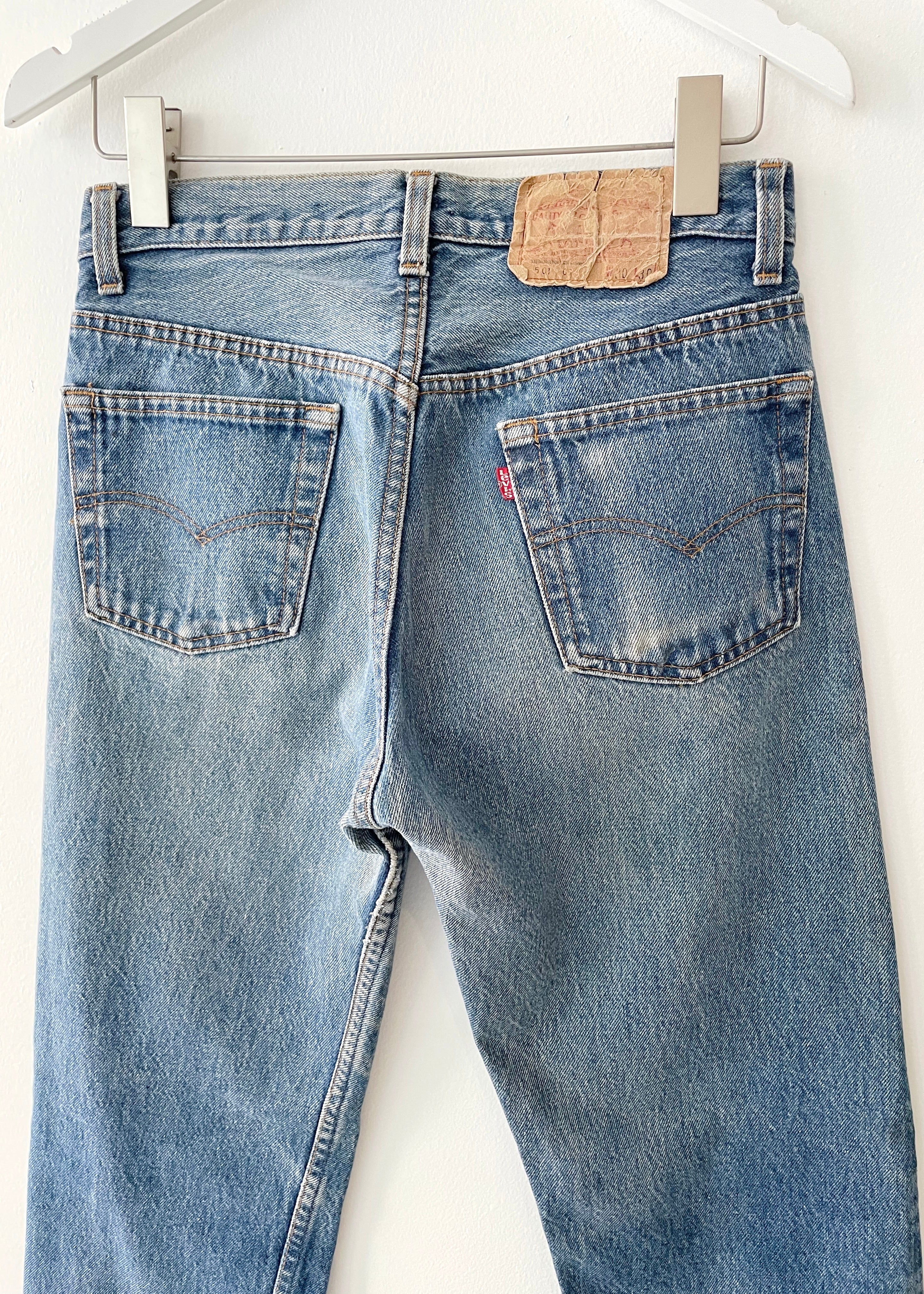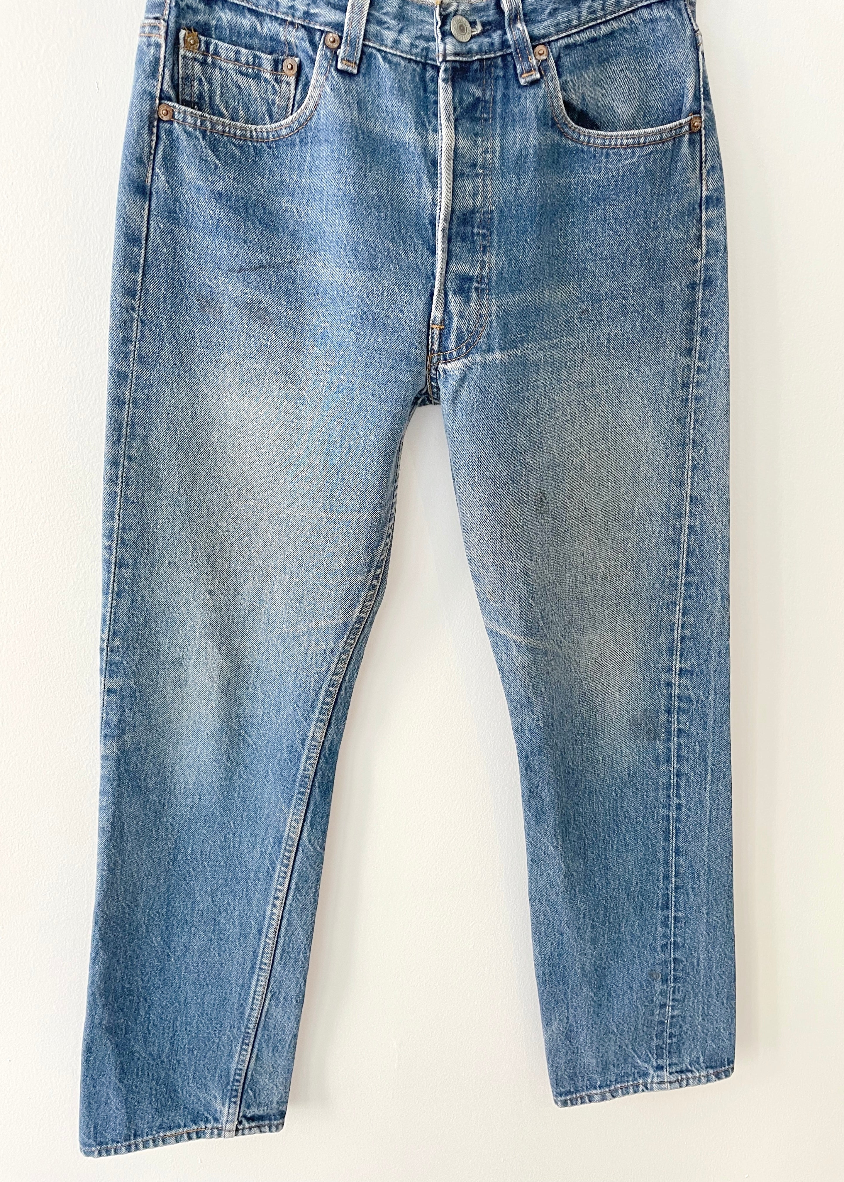 Vintage 501 red tab levis. Medium to dark wash, straight relaxed leg jeans. 5 pockets, 6 rivets. Button fly.