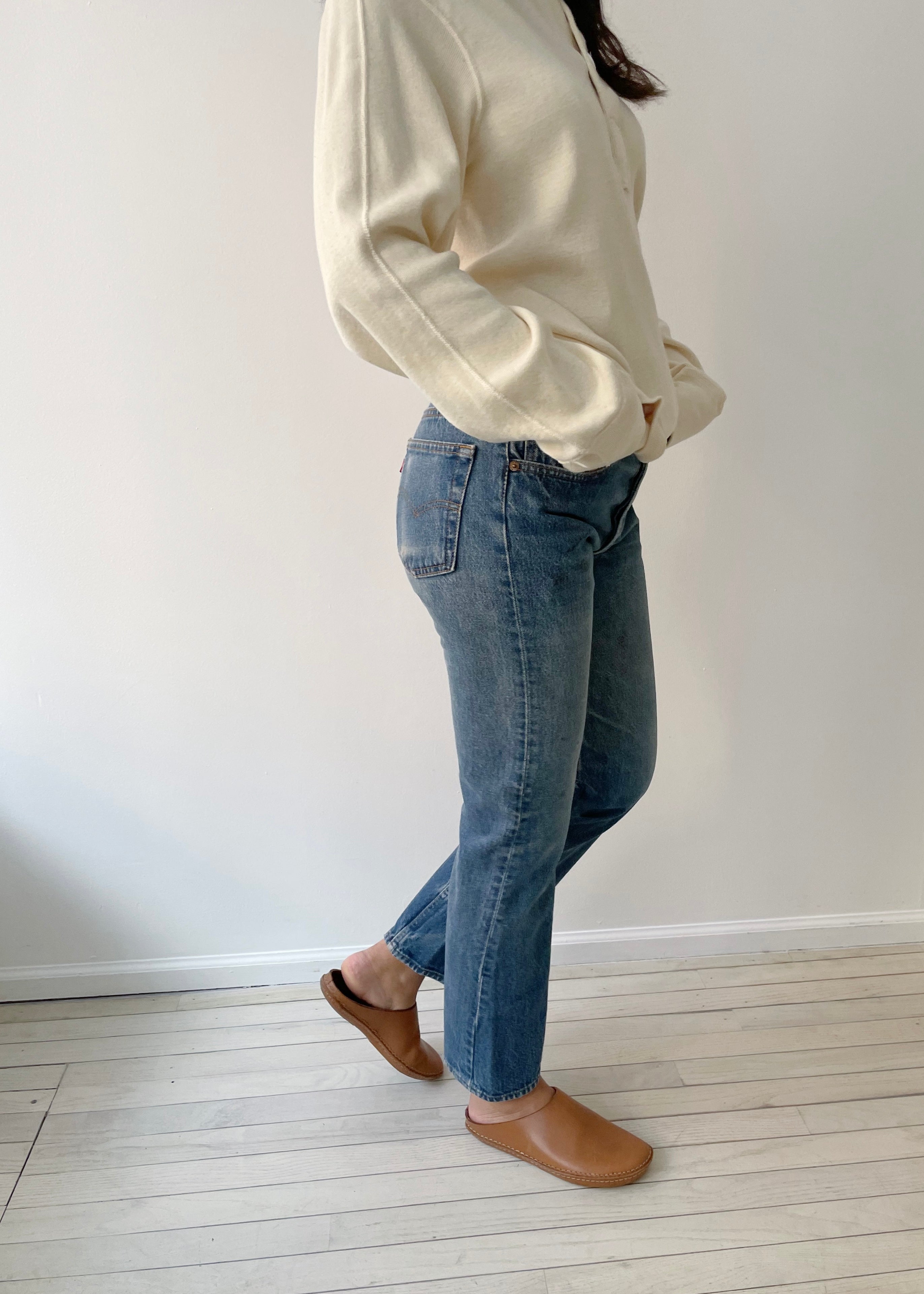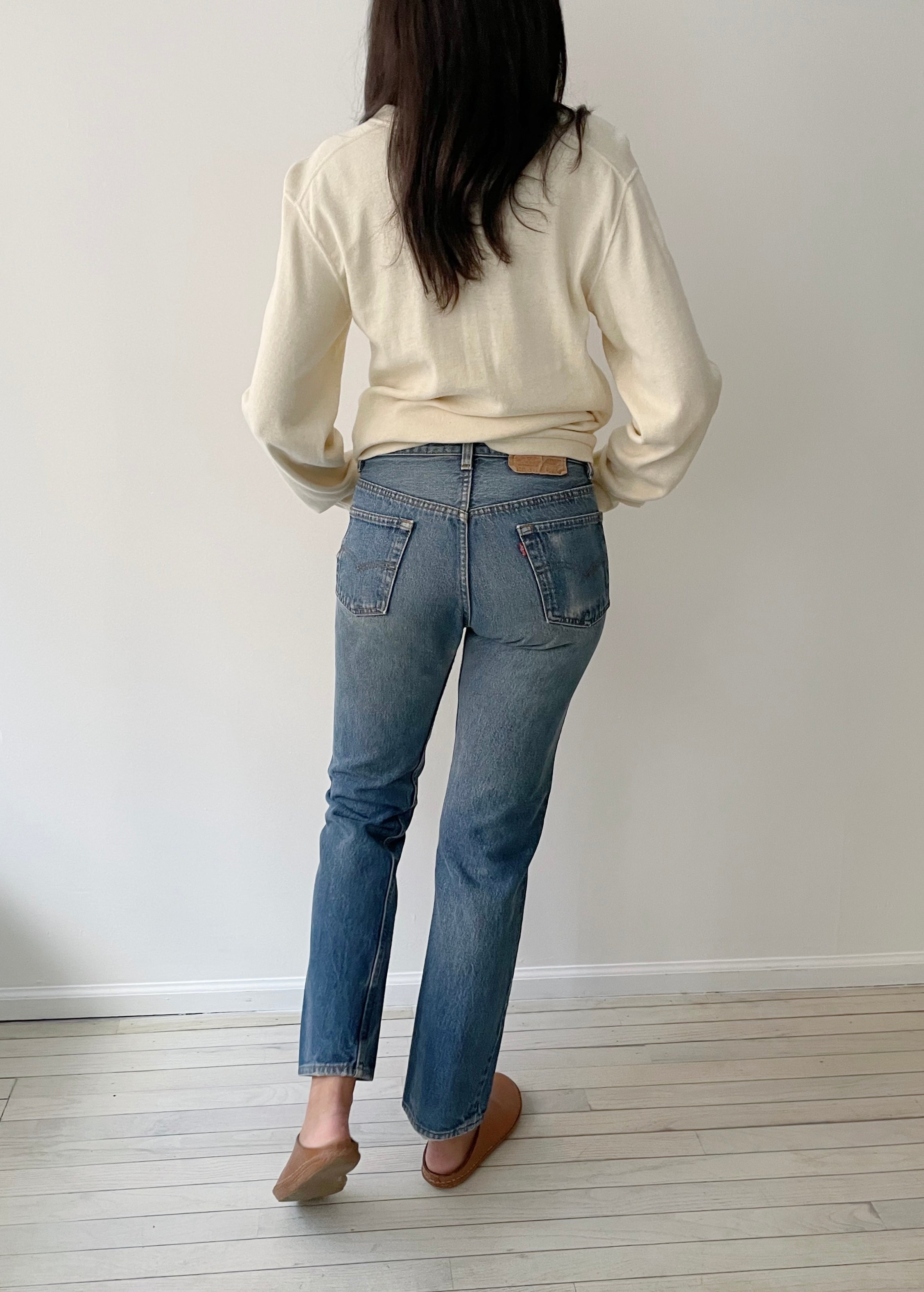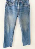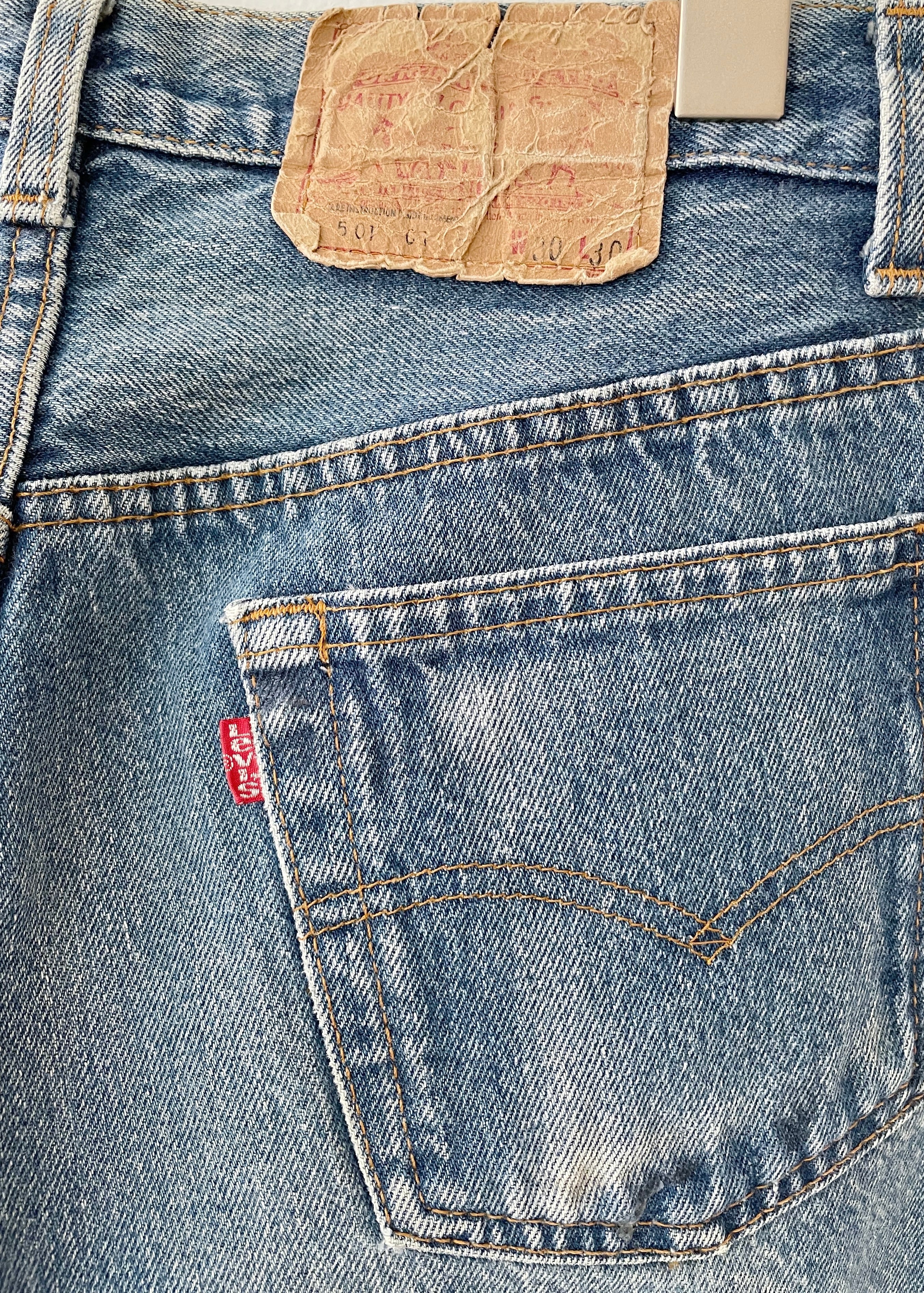 Vintage 501 red tab levis. Medium to dark wash, straight relaxed leg jeans. 5 pockets, 6 rivets. Button fly.