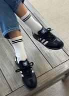 Slightly longer than a classic crew, with a contrast double stripe.