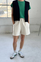 A versatile take on classic denim shorts, featuring subtly flared panels for optimal comfort and shape. With a high-waisted design, elasticated band, and convenient side pockets, they are a perfect wardrobe staple.