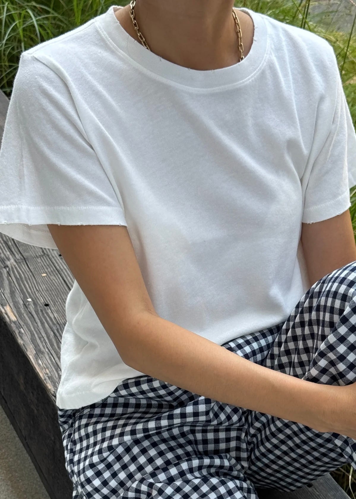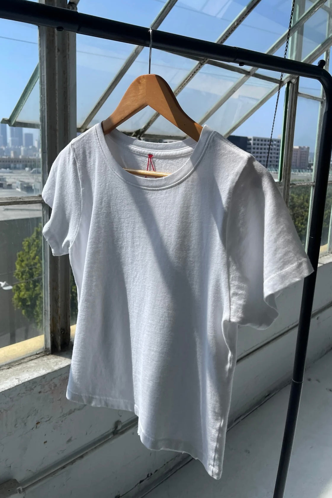 Meet the Darling Tee — It strikes the ideal balance between The Little Boy Tee's fit and the Vintage Boy Tee's worn-in charm. Featuring a relaxed boxy silhouette that hits the perfect waist length, it offers gently distressed details and a 90's fade for a true vintage allure. Crafted from locally sourced cotton, this low gauge knit tee combines a light, airy feel with a beautifully structured yet soft touch, giving you the vintage feel you long for.