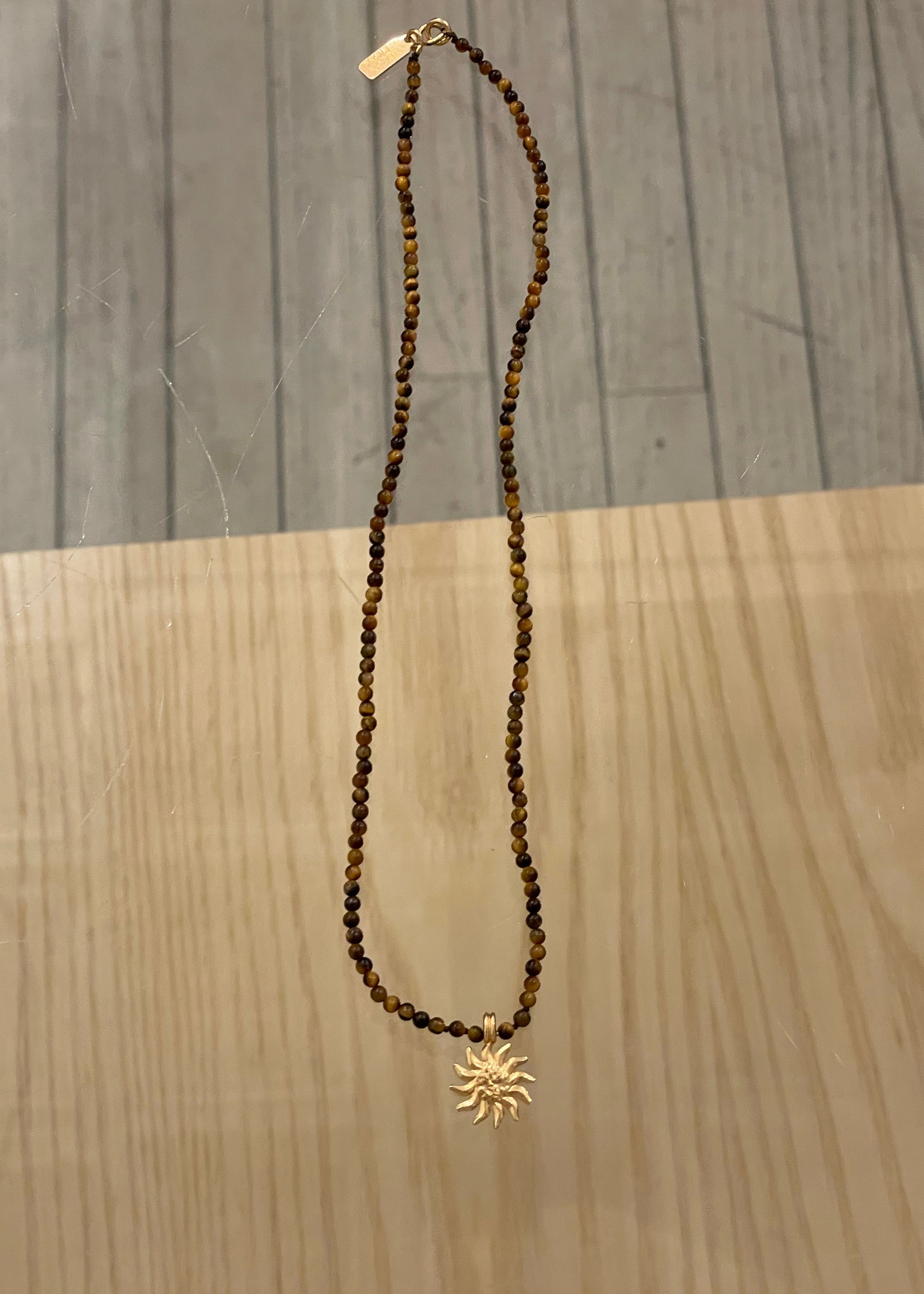 Handmade of miniature Tiger Eye Stones and a mini Aurora Lioness charm with a 14k Gold Vermeil clasp. Charm in 14k Gold Vermeil. Perfect for layering.