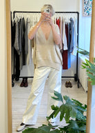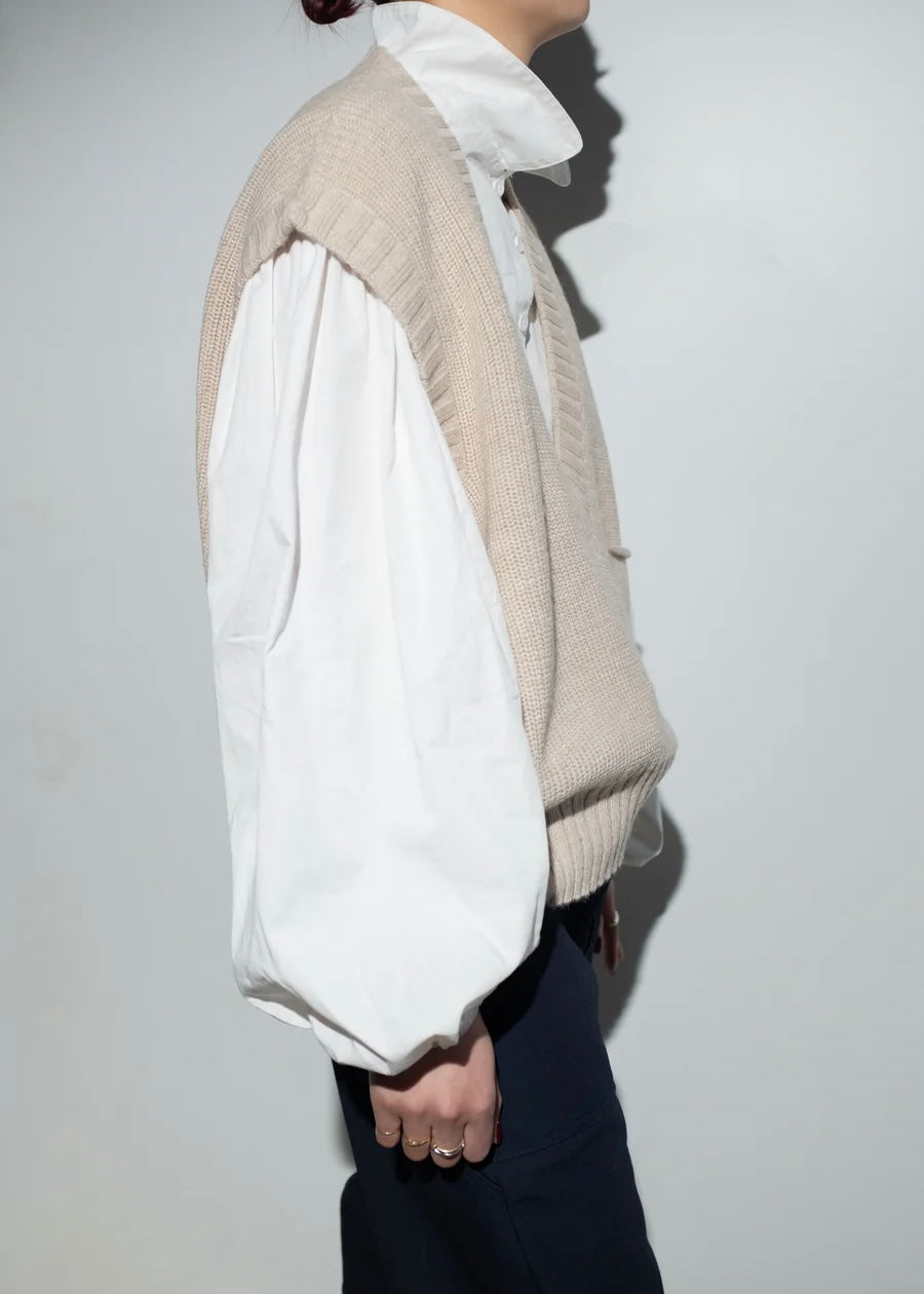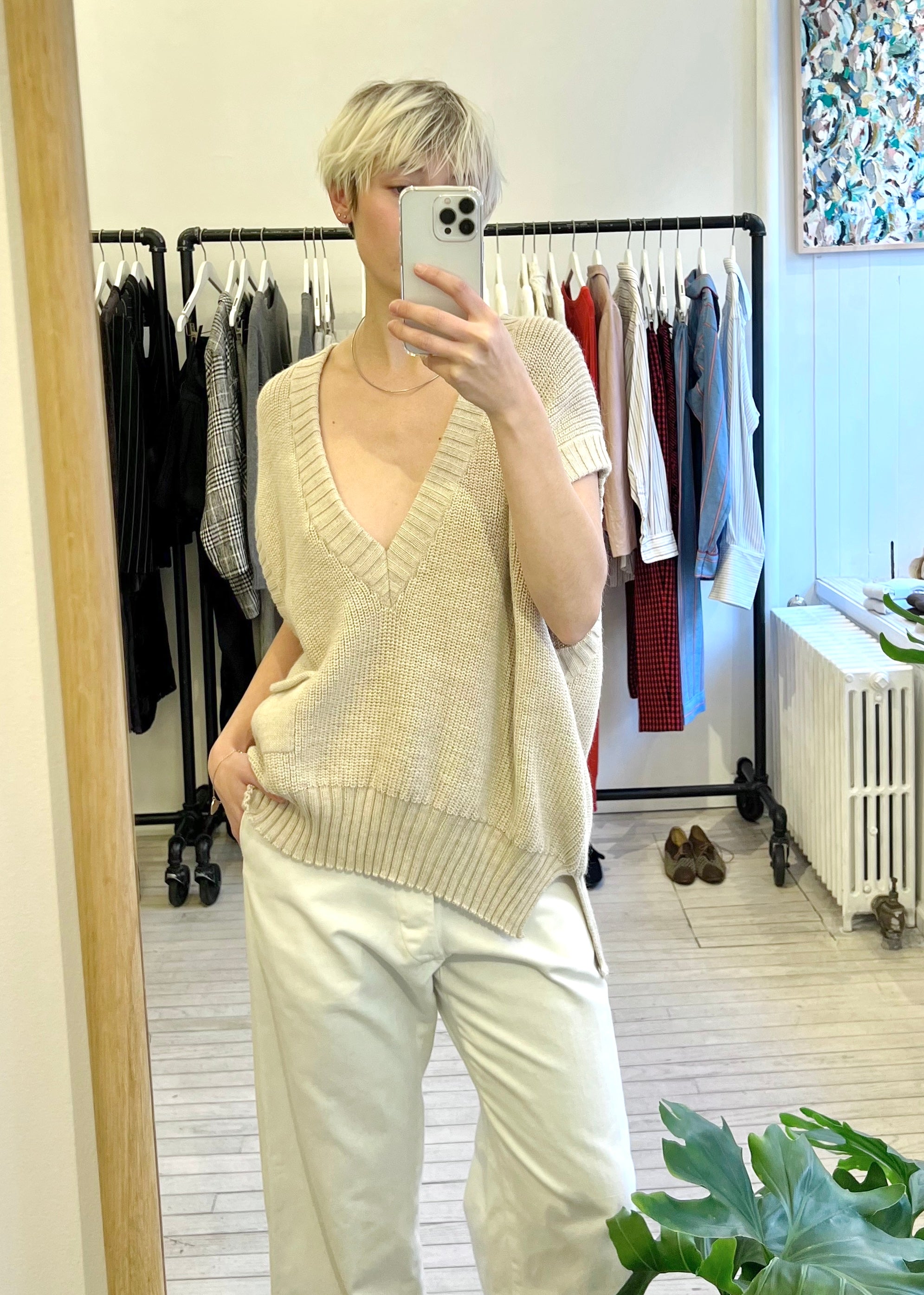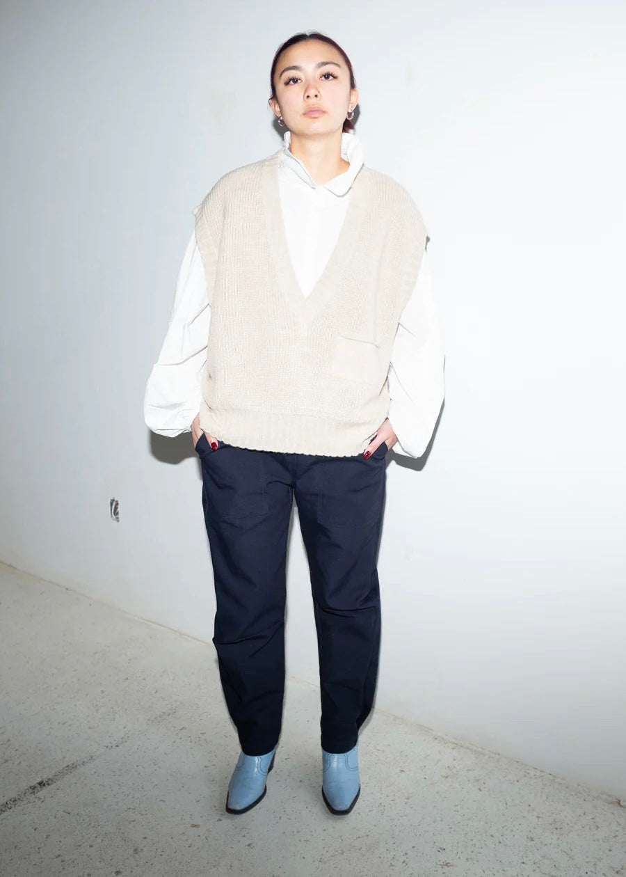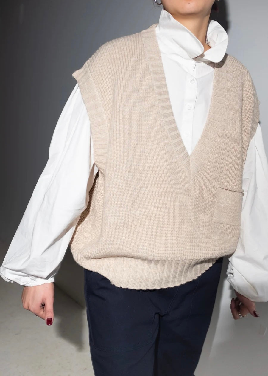 Sleeveless knit v-neck vest with front pocket. Oversized fit.