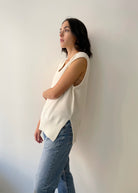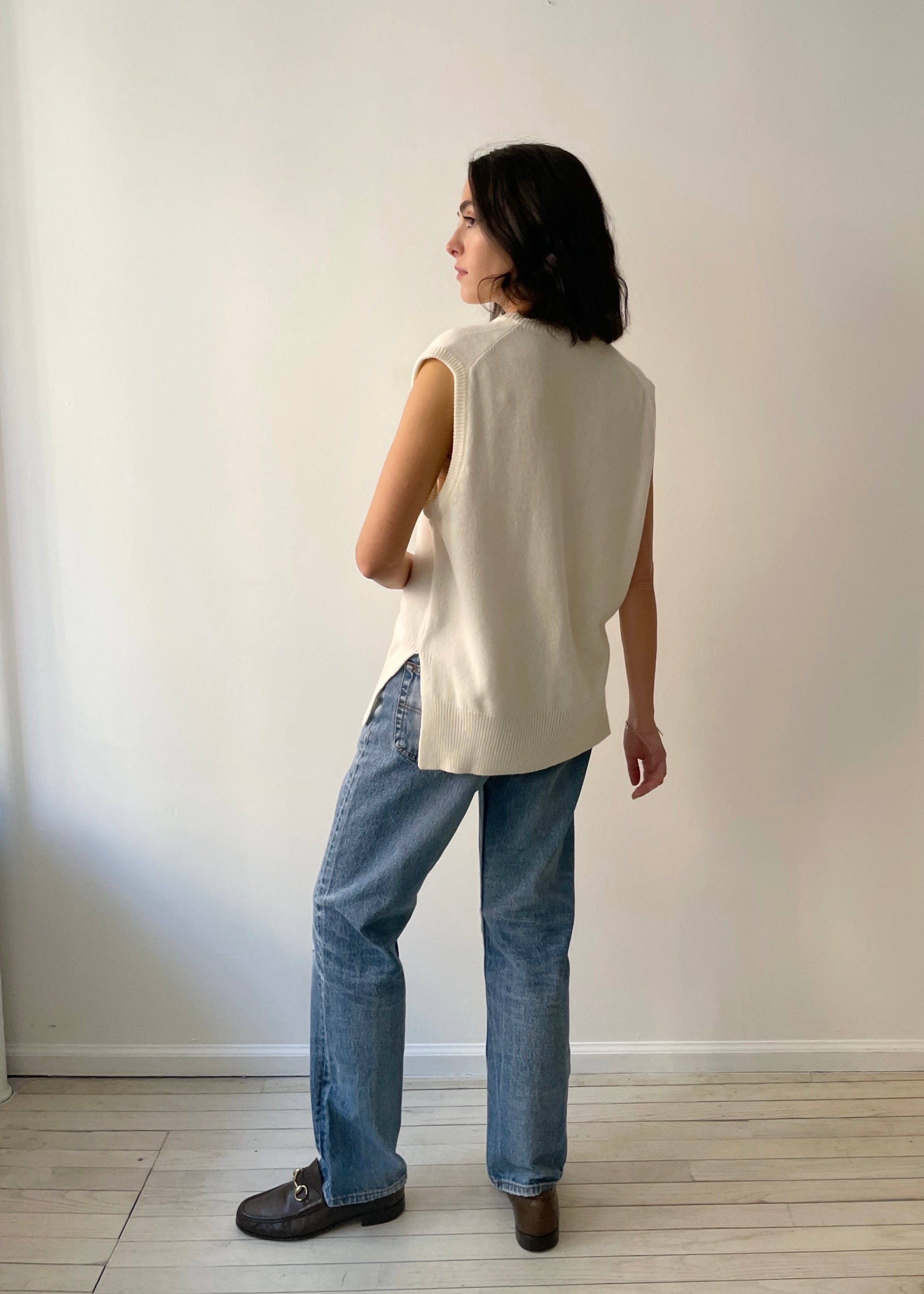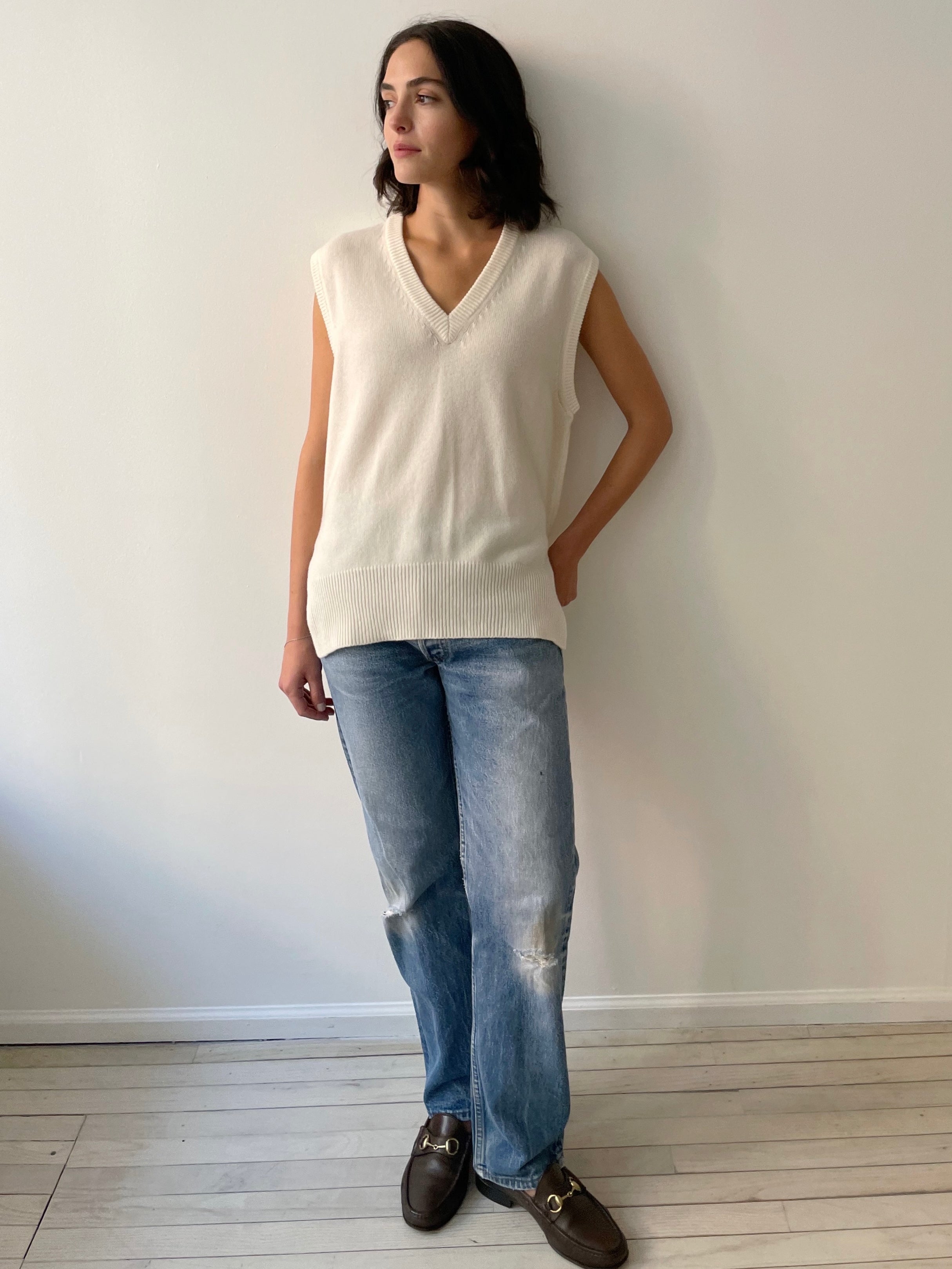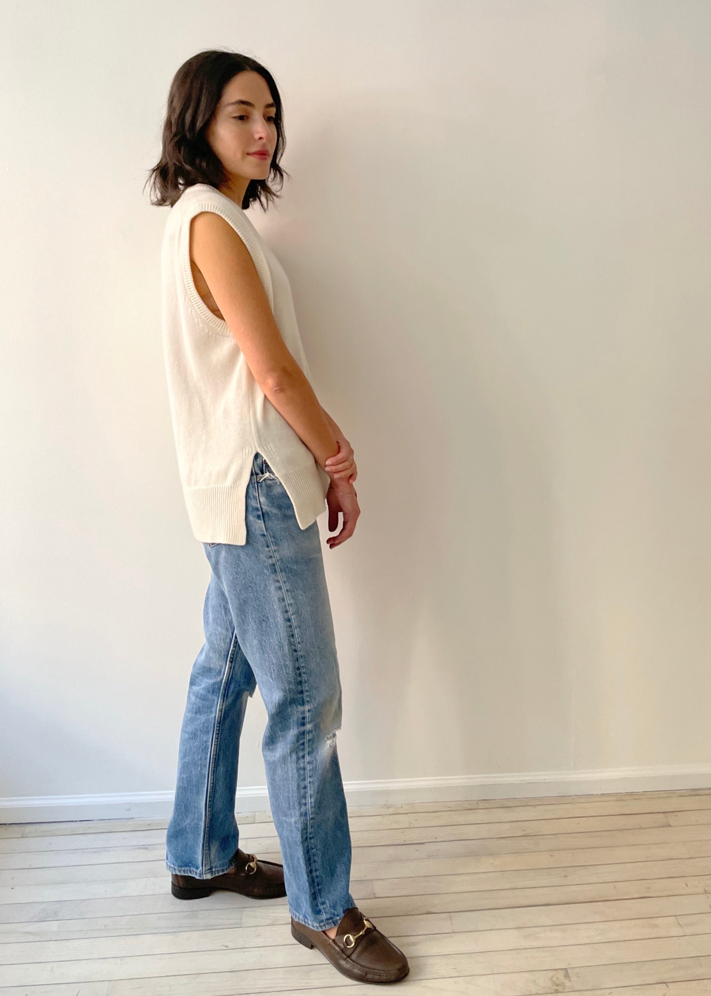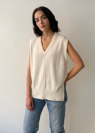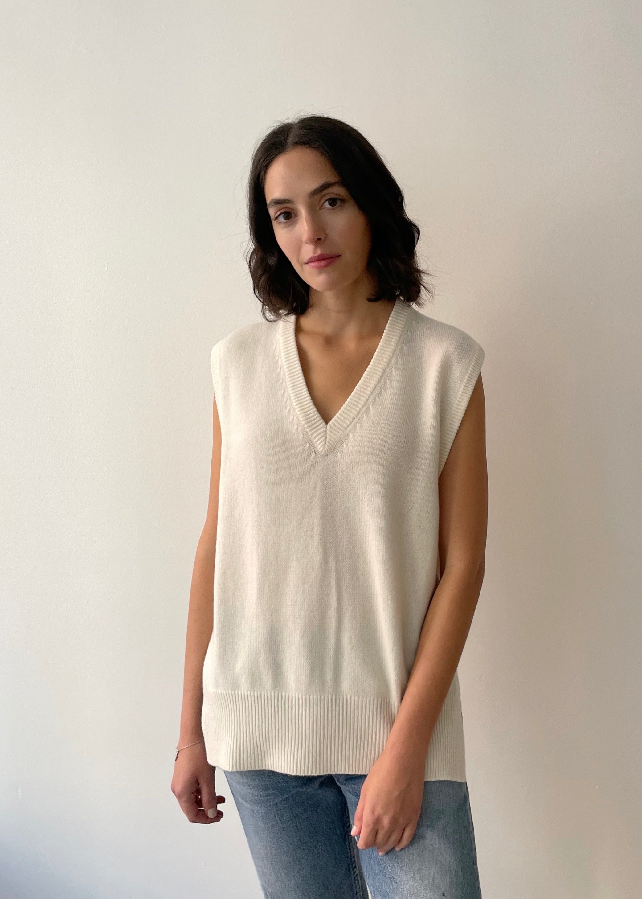 Felicity Cashmere Vest by Estella. Knitted in an ultra soft mid-weight cashmere. Wear on its own or layered perfectly over a menswear button down. Featuring a v-neckline, english ribbing details, relaxed oversized fit, longer body and side slits.