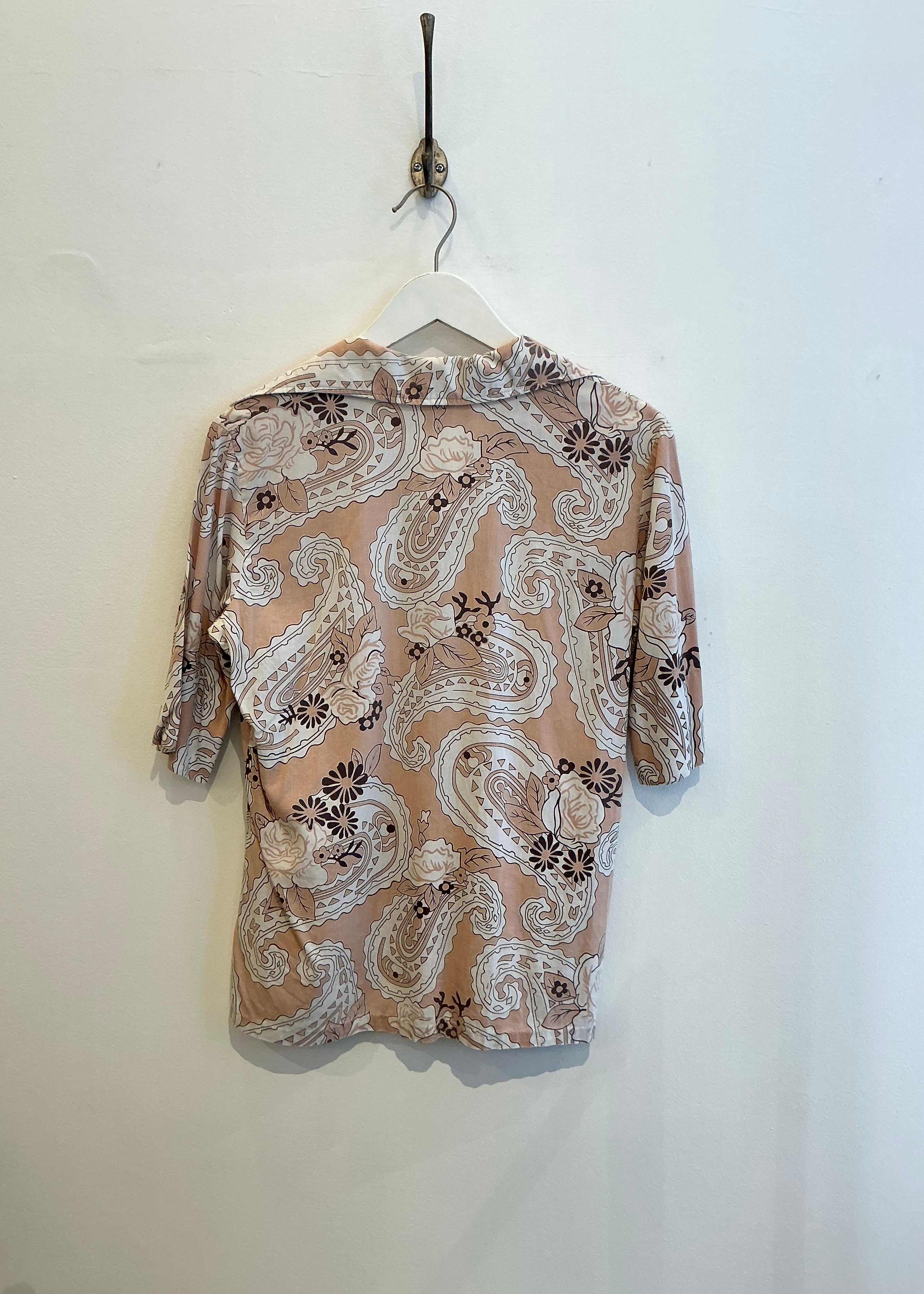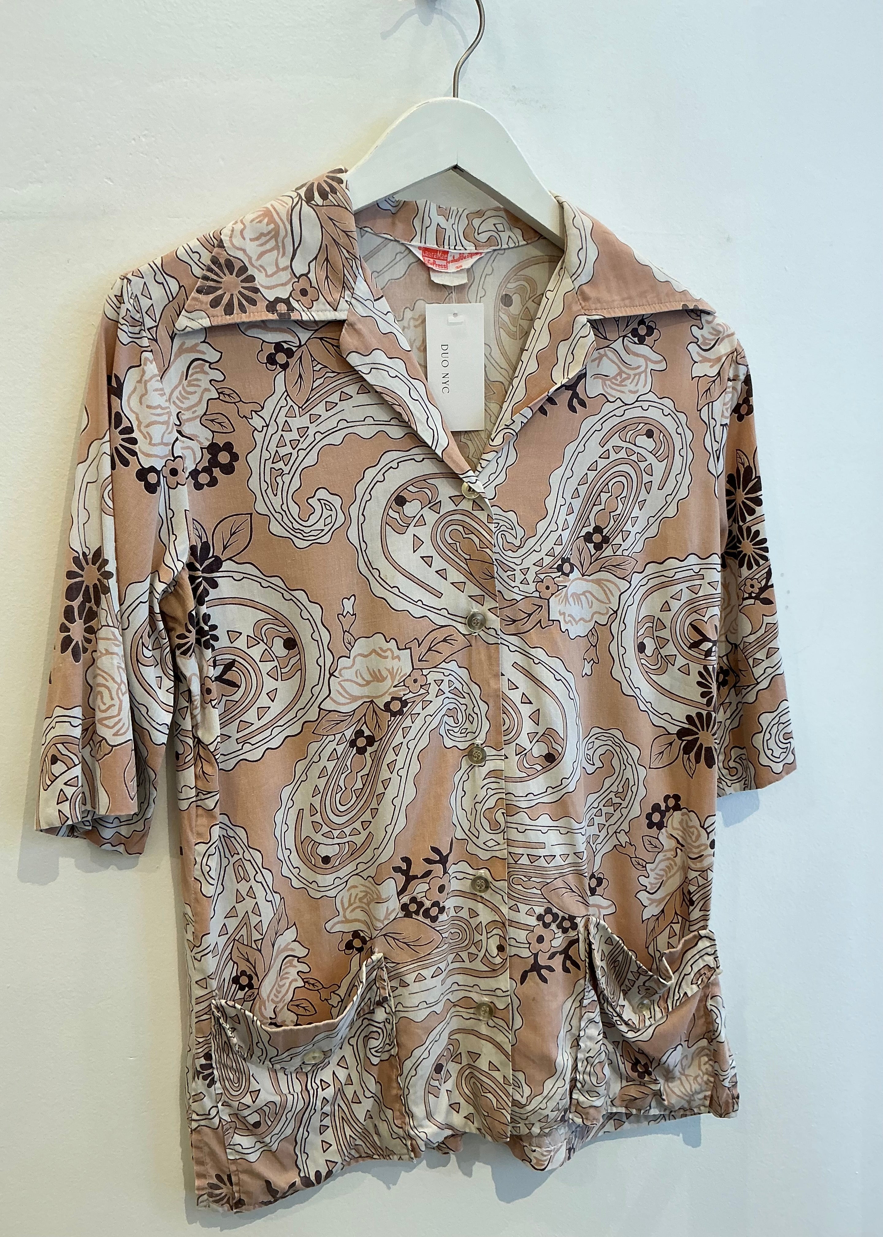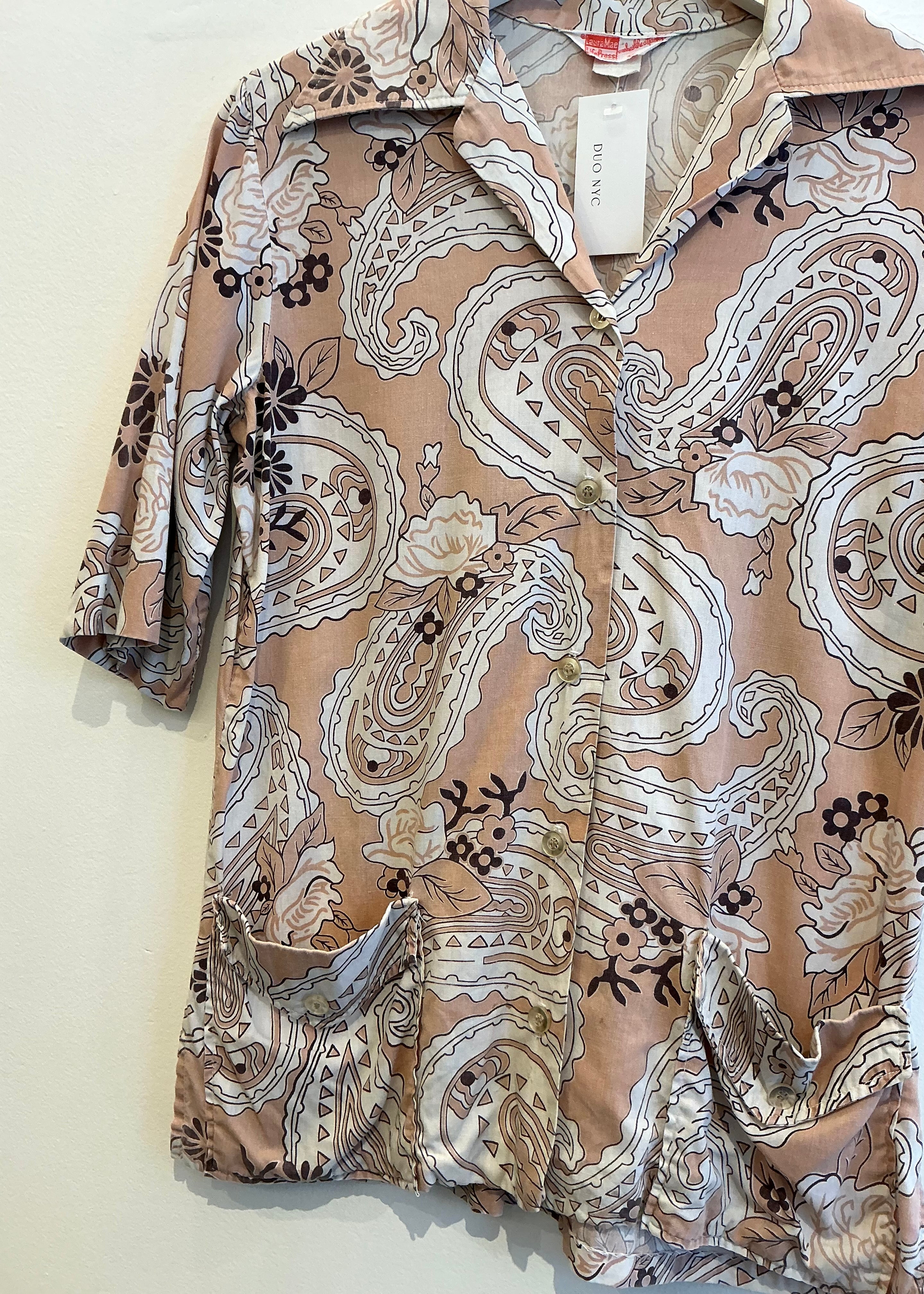 Vintage 1950s short sleeve button up shirt. Paisley and floral print with two bottom front pockets. In very good condition - subtle staining towards bottom of shirt.