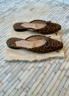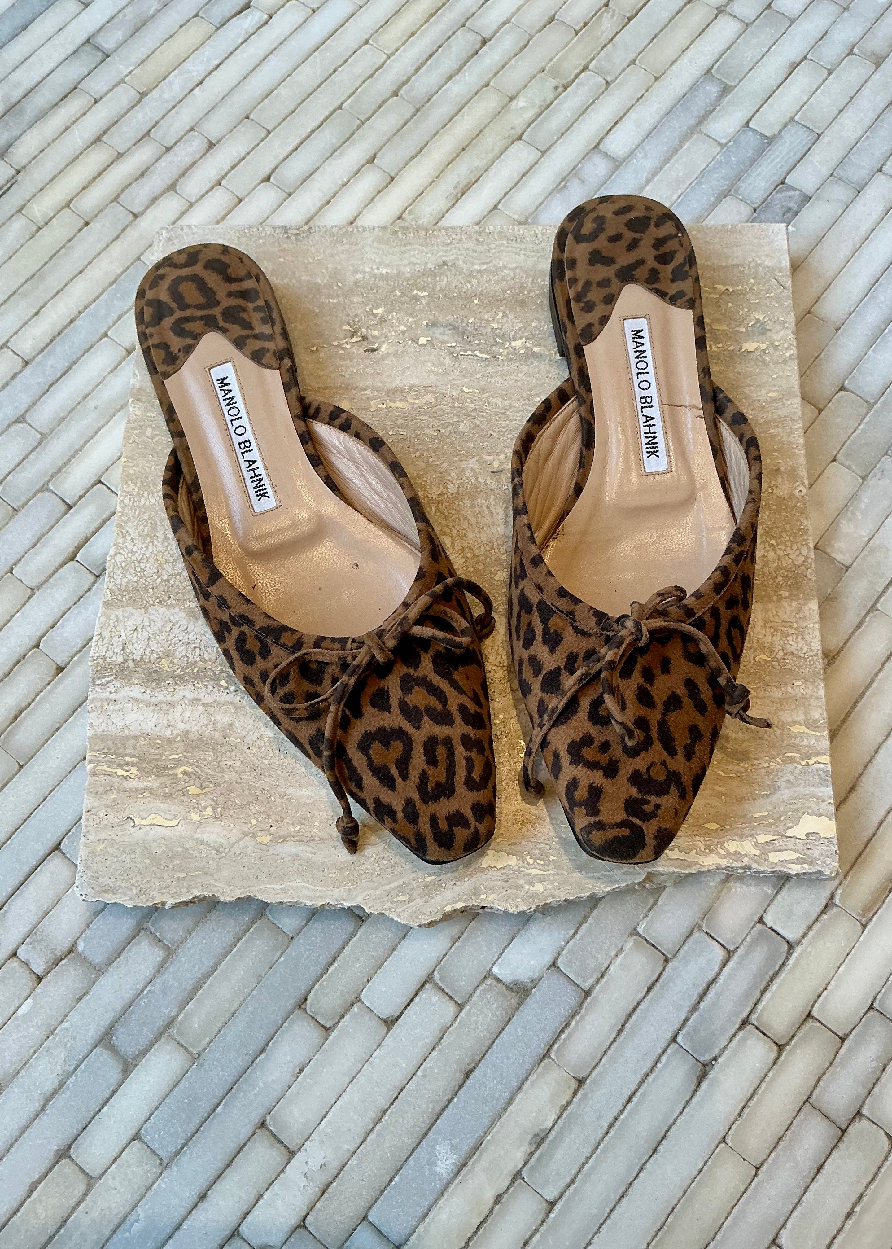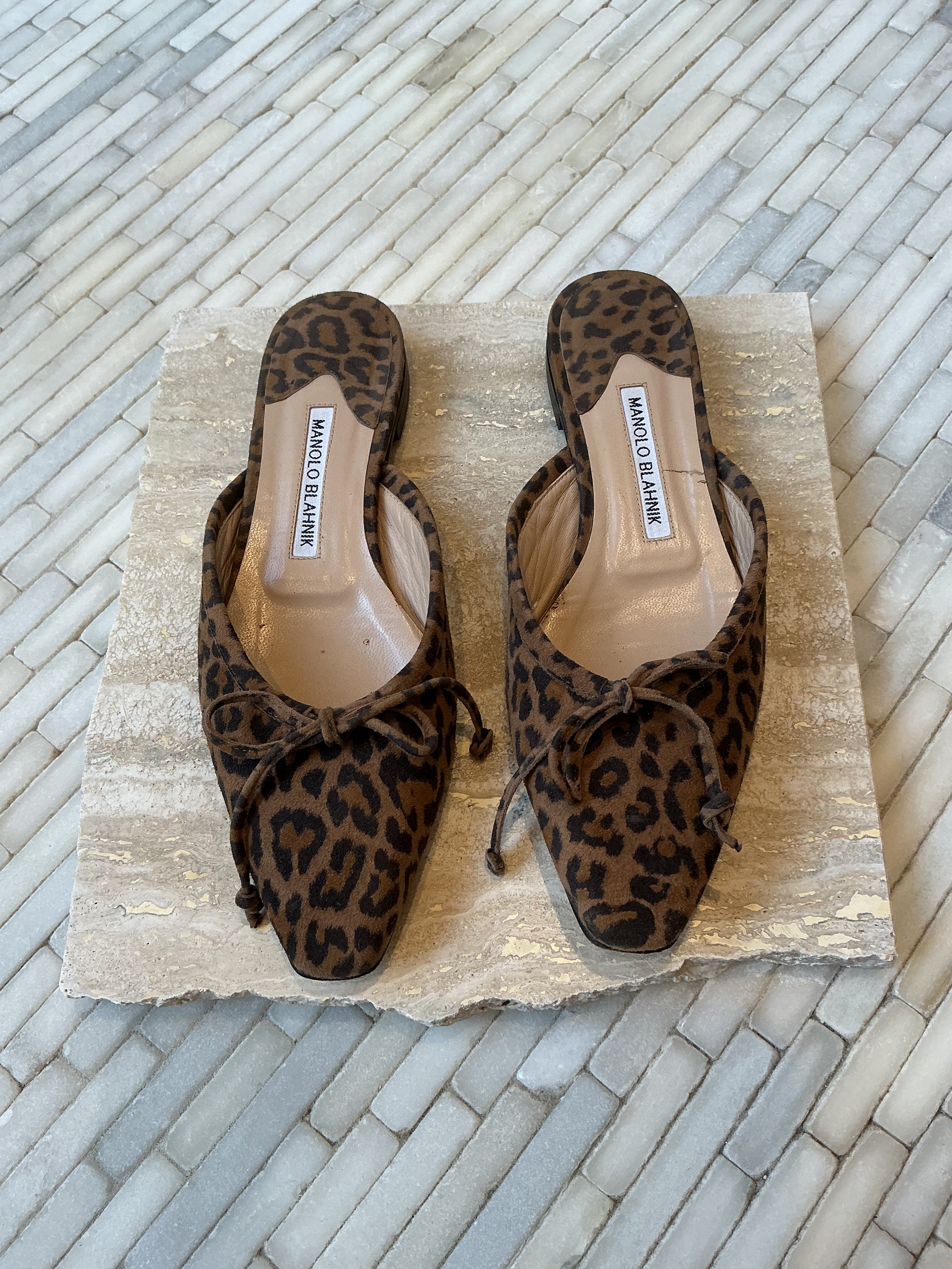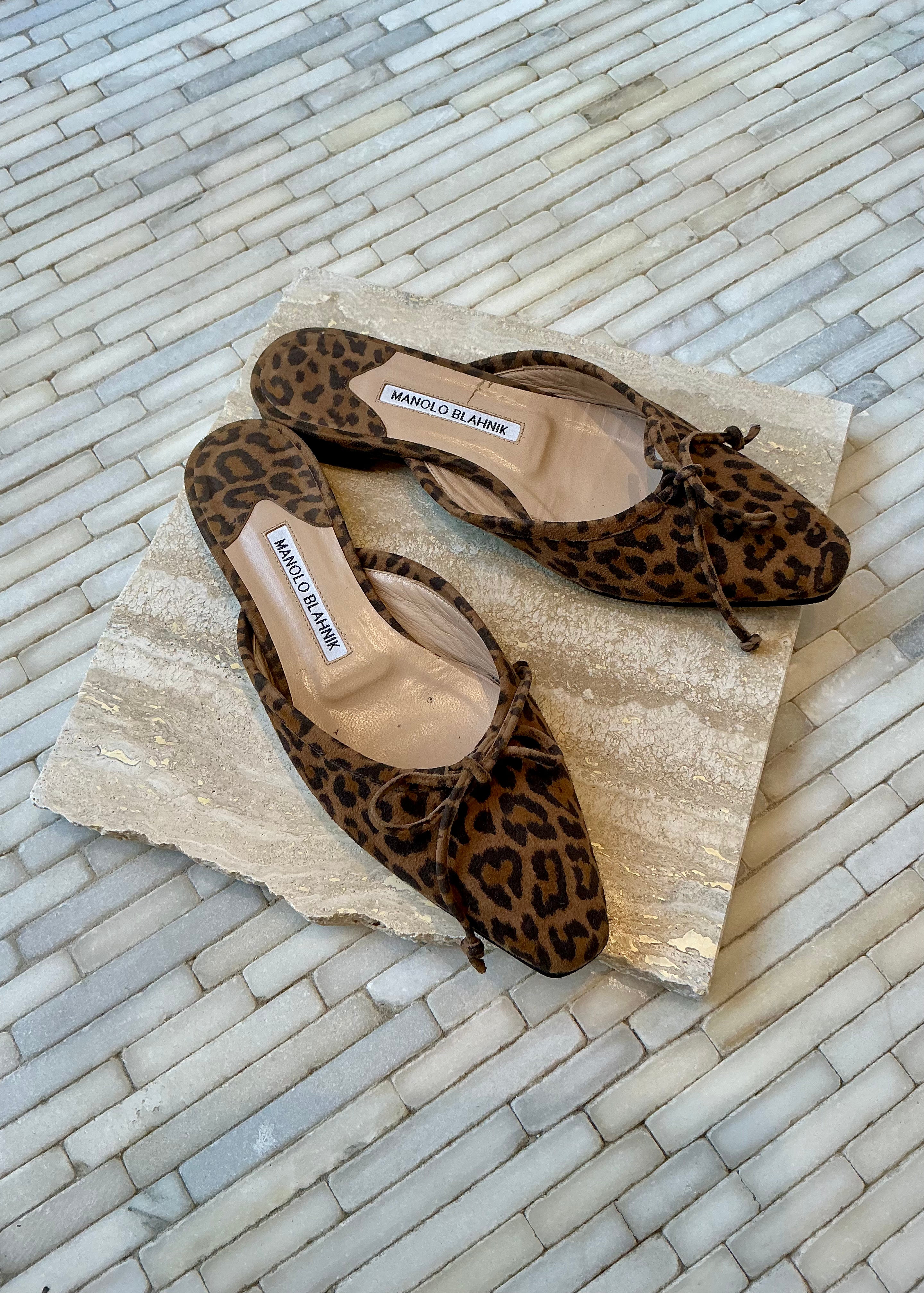 Vintage Manolo Blahnik suede leopard print flats with ties at top of shoe.