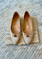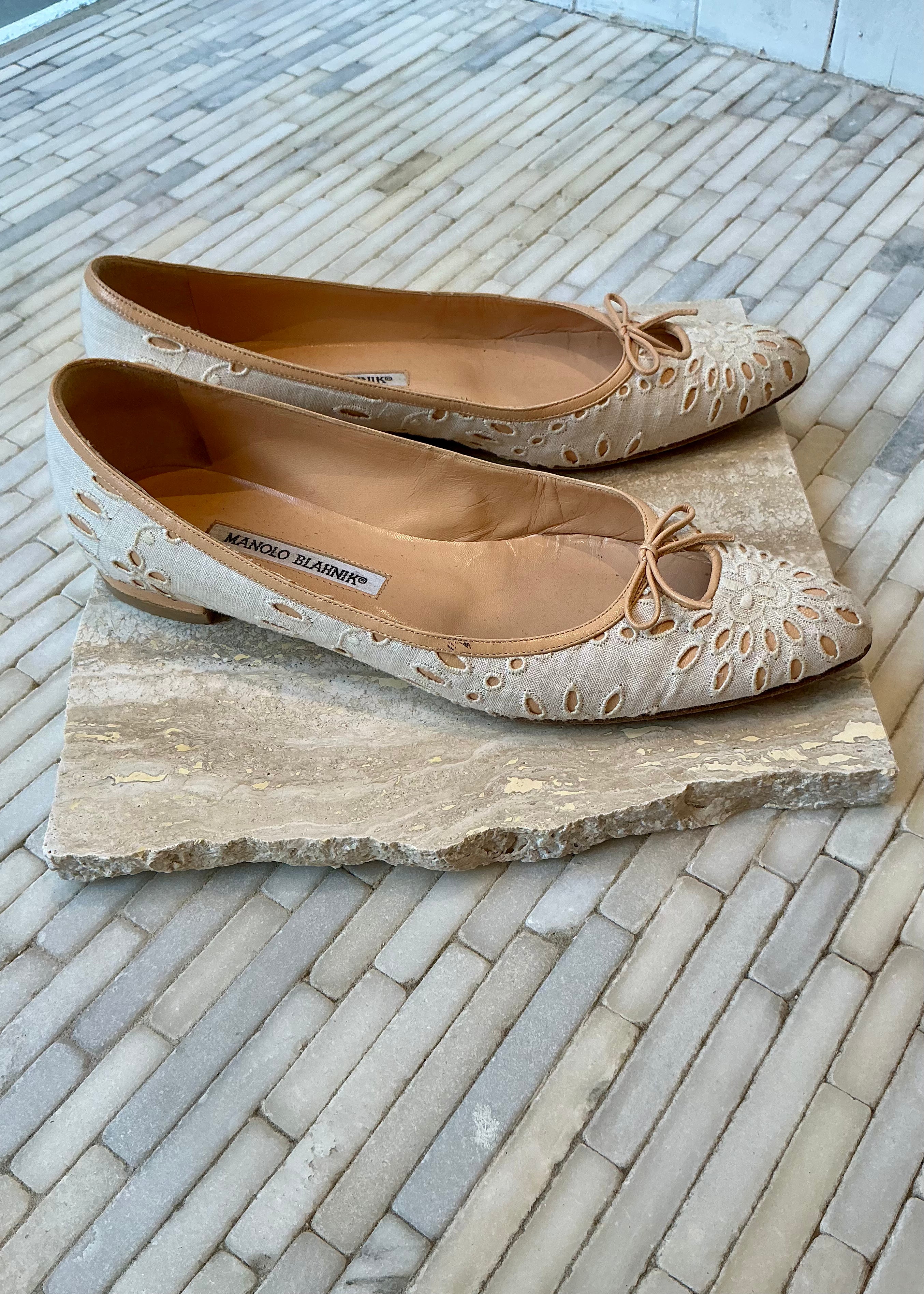 Vintage Manolo Blahnik leather flats with cloth cut out pattern. Bows at top of shoes.