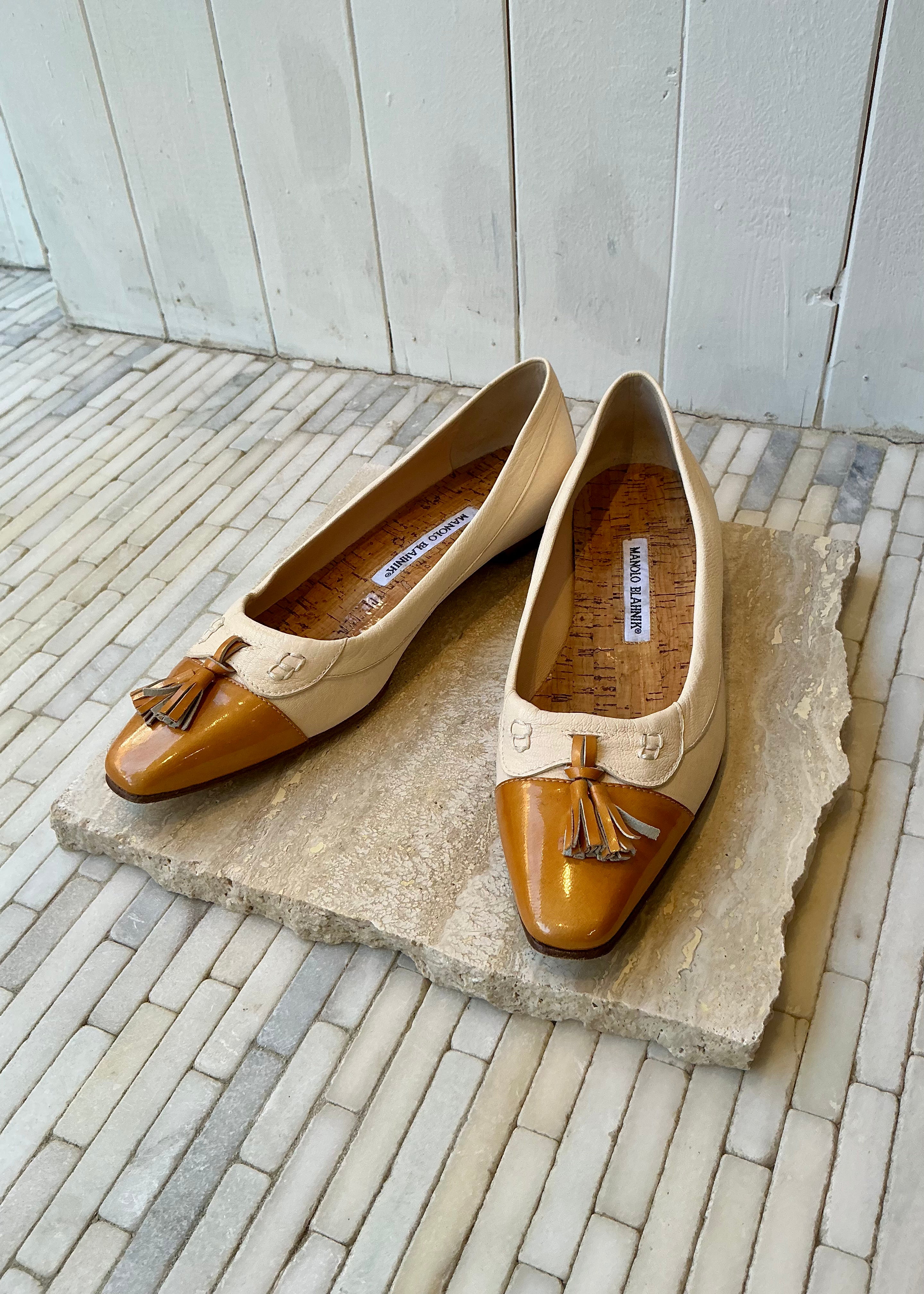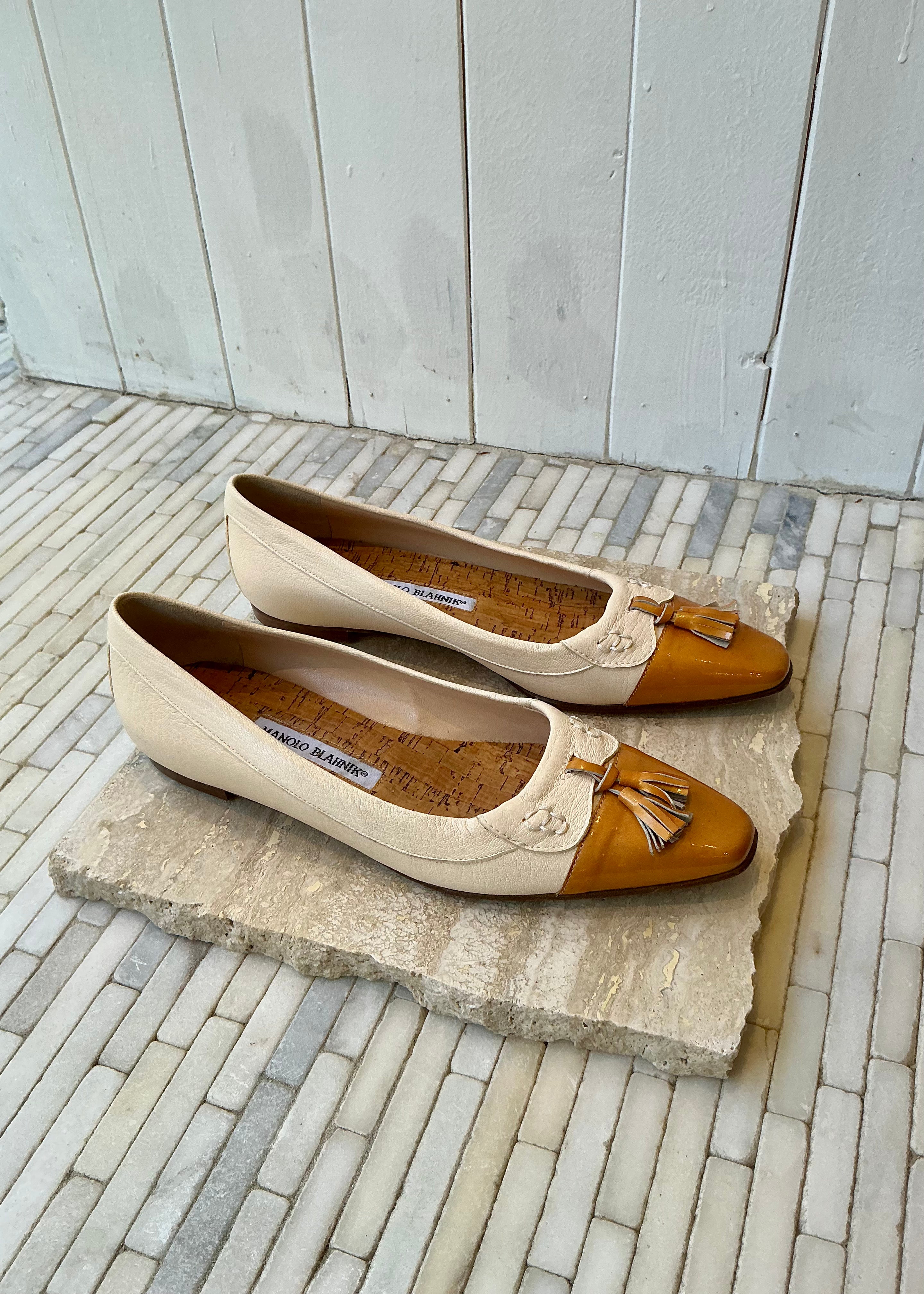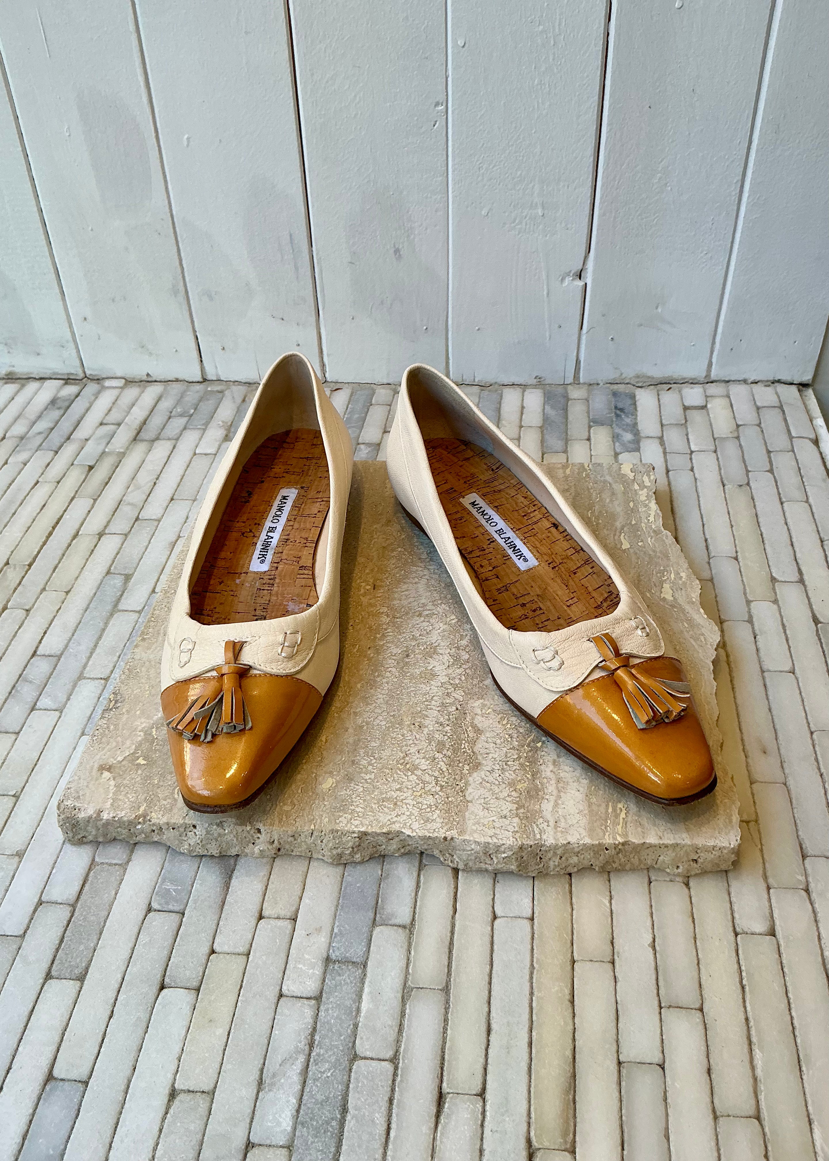 Vintage Manolo Blahnik flats with tassel detail at top of shoe.
