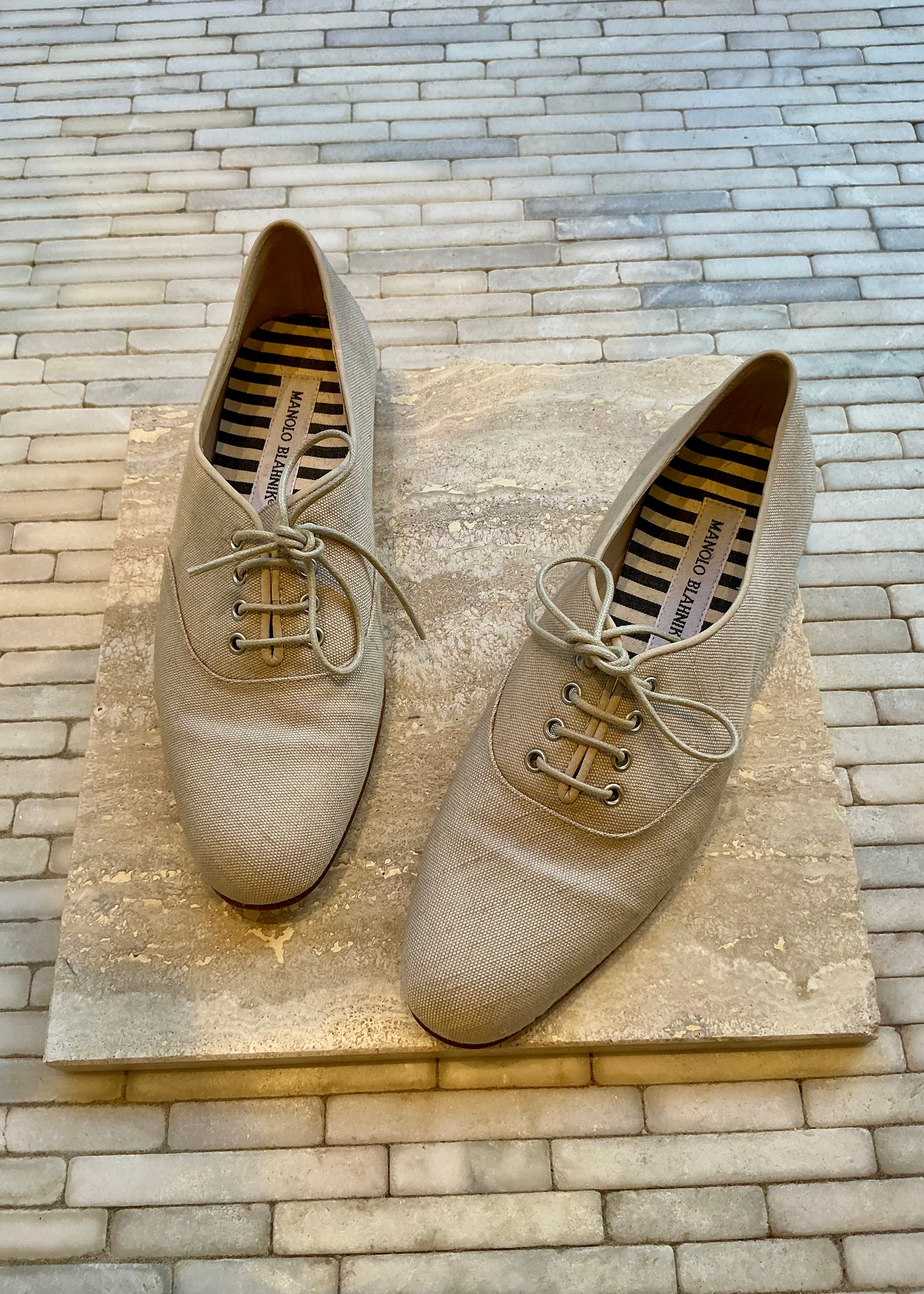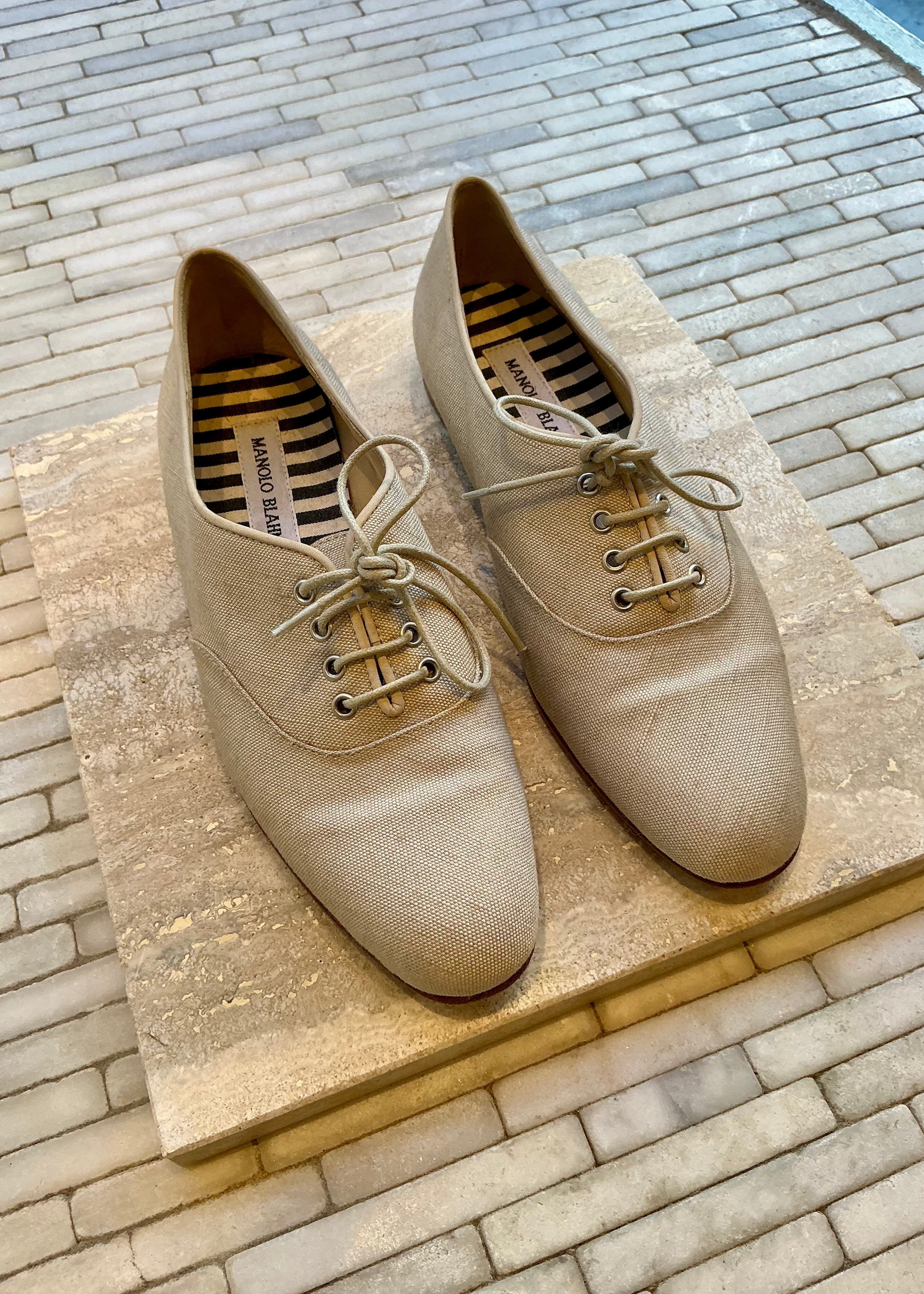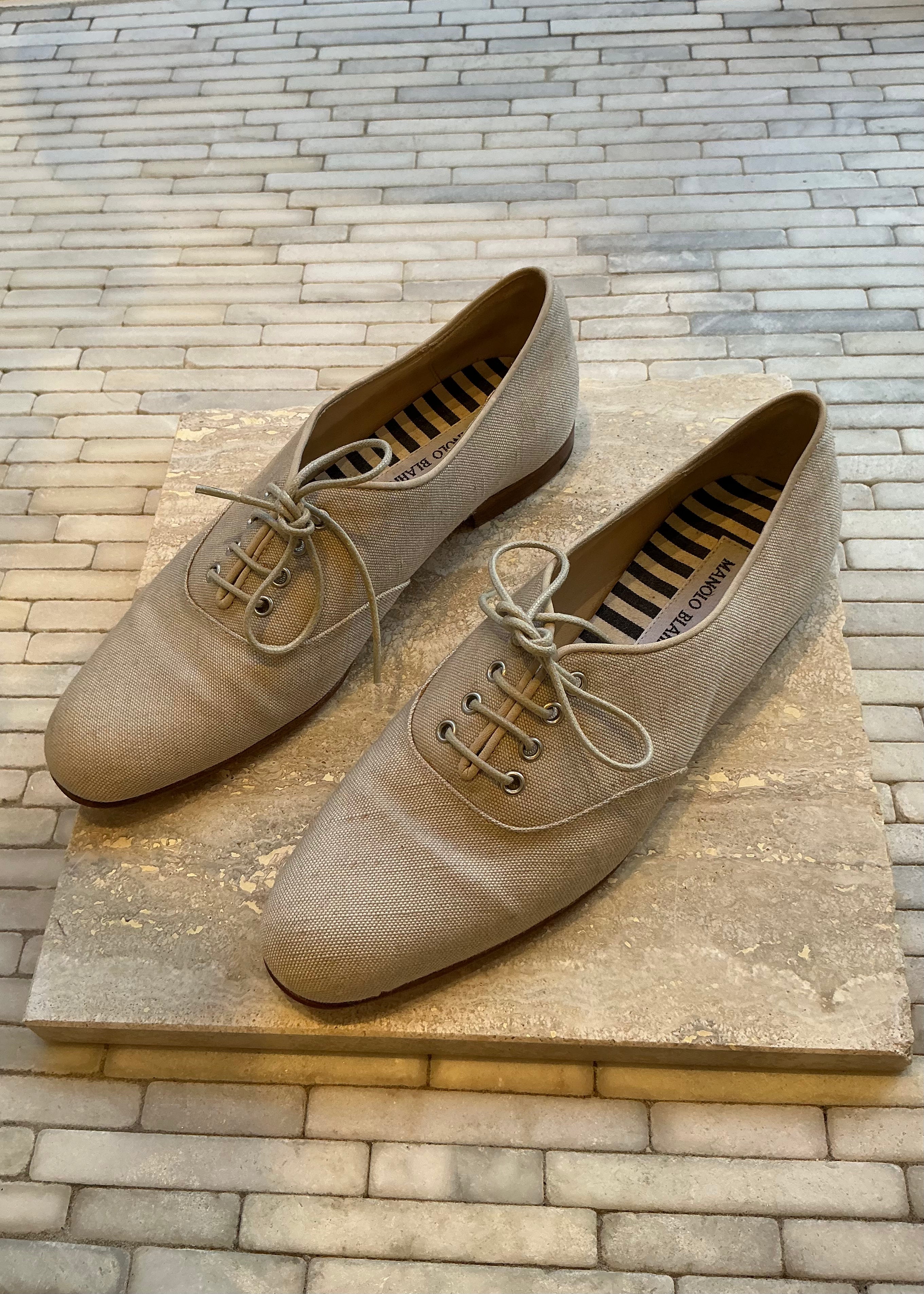 Vintage Manolo Blahnik lace up shoes. Made of a cloth material.